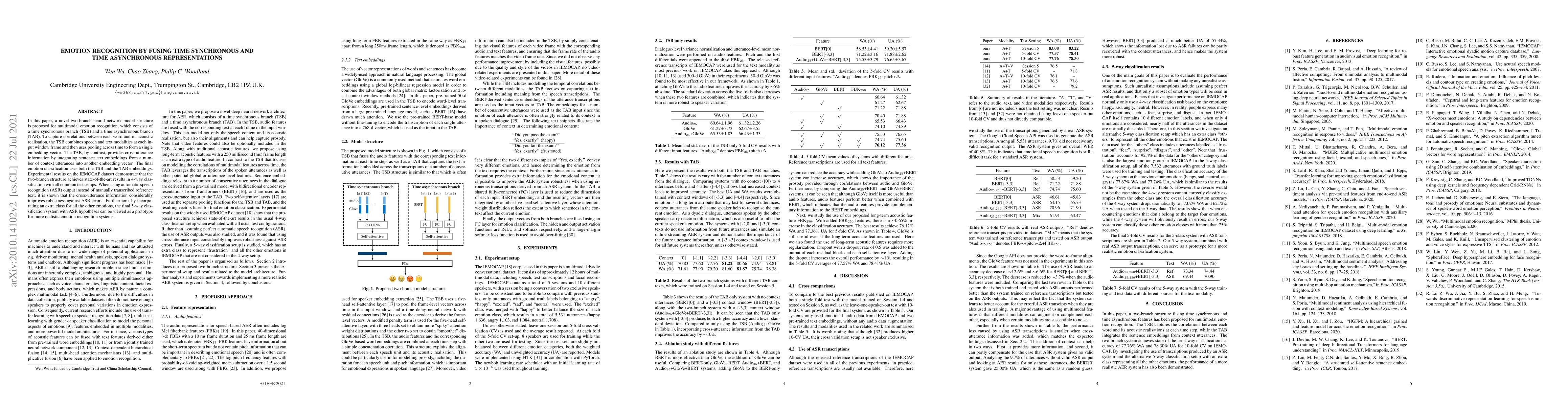 In this paper, a novel two-branch neural network model structure is proposed for multimodal emotion recognition, which consists of a time synchronous branch (TSB) and a time asynchronous branch (TAB). To capture correlations between each word and its acoustic realisation, the TSB combines speech and text modalities at each input window frame and then does pooling across time to form a single embedding vector. The TAB, by contrast, provides cross-utterance information by integrating sentence text embeddings from a number of context utterances into another embedding vector. The final emotion classification uses both the TSB and the TAB embeddings. Experimental results on the IEMOCAP dataset demonstrate that the two-branch structure achieves state-of-the-art results in 4-way classification with all common test setups. When using automatic speech recognition (ASR) output instead of manually transcribed reference text, it is shown that the cross-utterance information considerably improves the robustness against ASR errors. Furthermore, by incorporating an extra class for all the other emotions, the final 5-way classification system with ASR hypotheses can be viewed as a prototype for more realistic emotion recognition systems.