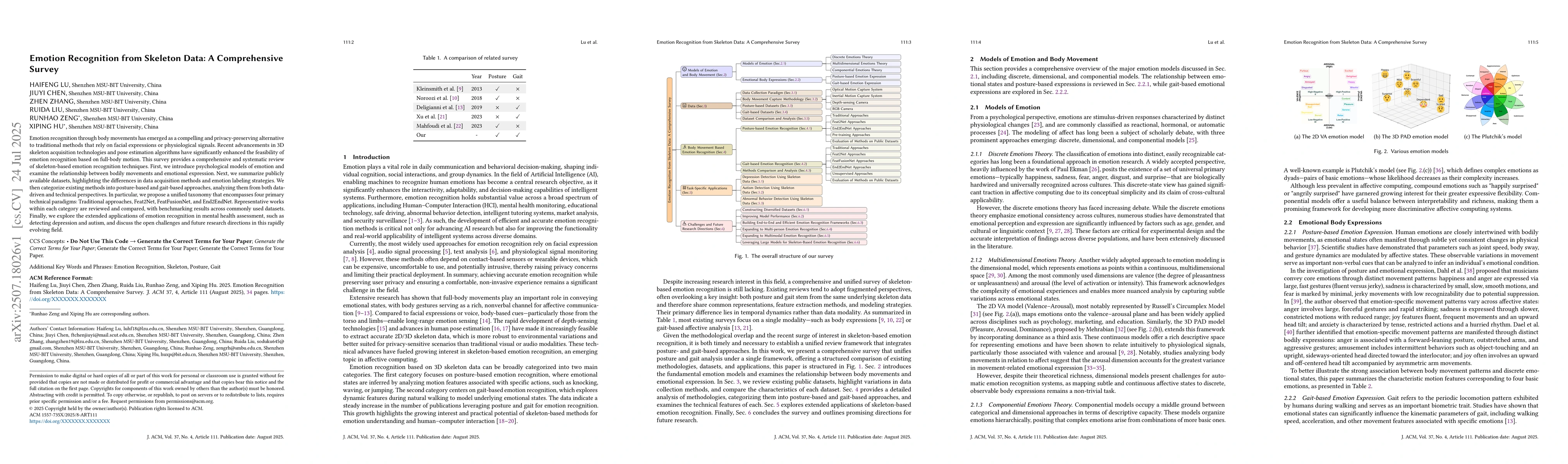 Emotion recognition through body movements has emerged as a compelling and privacy-preserving alternative to traditional methods that rely on facial expressions or physiological signals. Recent advancements in 3D skeleton acquisition technologies and pose estimation algorithms have significantly enhanced the feasibility of emotion recognition based on full-body motion. This survey provides a comprehensive and systematic review of skeleton-based emotion recognition techniques. First, we introduce psychological models of emotion and examine the relationship between bodily movements and emotional expression. Next, we summarize publicly available datasets, highlighting the differences in data acquisition methods and emotion labeling strategies. We then categorize existing methods into posture-based and gait-based approaches, analyzing them from both data-driven and technical perspectives. In particular, we propose a unified taxonomy that encompasses four primary technical paradigms: Traditional approaches, Feat2Net, FeatFusionNet, and End2EndNet. Representative works within each category are reviewed and compared, with benchmarking results across commonly used datasets. Finally, we explore the extended applications of emotion recognition in mental health assessment, such as detecting depression and autism, and discuss the open challenges and future research directions in this rapidly evolving field.