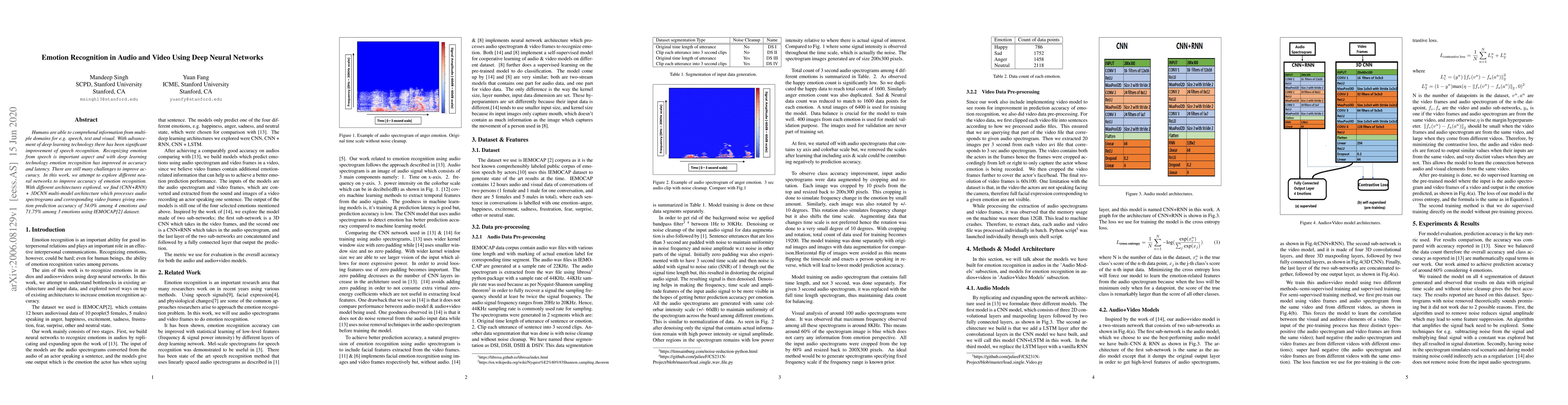 This research explores various deep neural network architectures to enhance emotion recognition from audio and video, achieving 54.0% accuracy for four emotions and 71.75% for three emotions using the IEMOCAP dataset, with a CNN+RNN + 3DCNN multi-model architecture showing the best results.