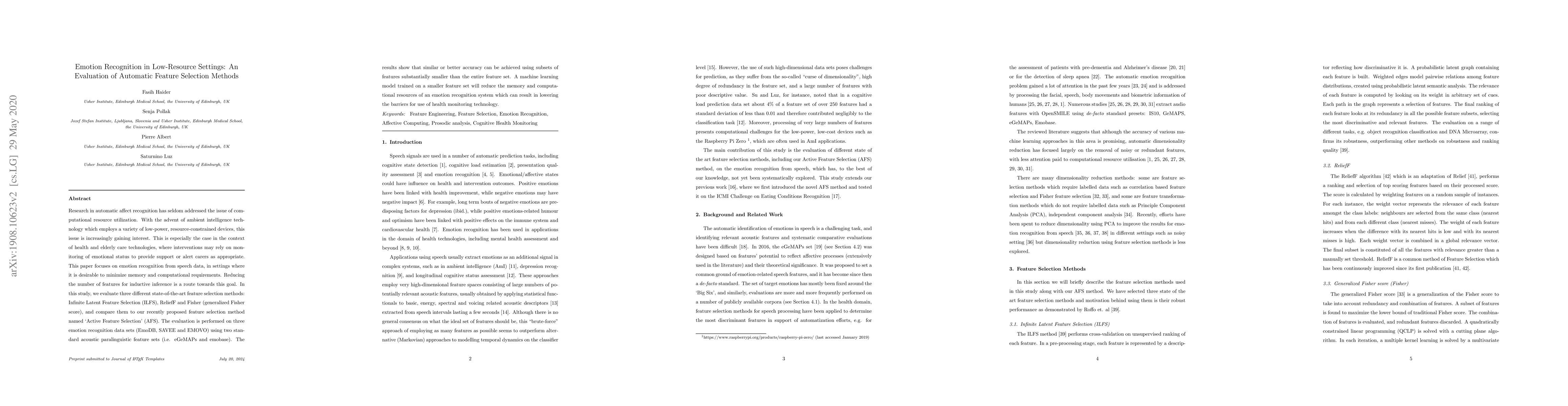 This paper evaluates automatic feature selection methods for emotion recognition in low-resource settings, focusing on minimizing memory and computational requirements. It compares three state-of-the-art methods against a new approach, finding that smaller feature sets can achieve similar or better accuracy, thus facilitating the deployment of health monitoring technologies.