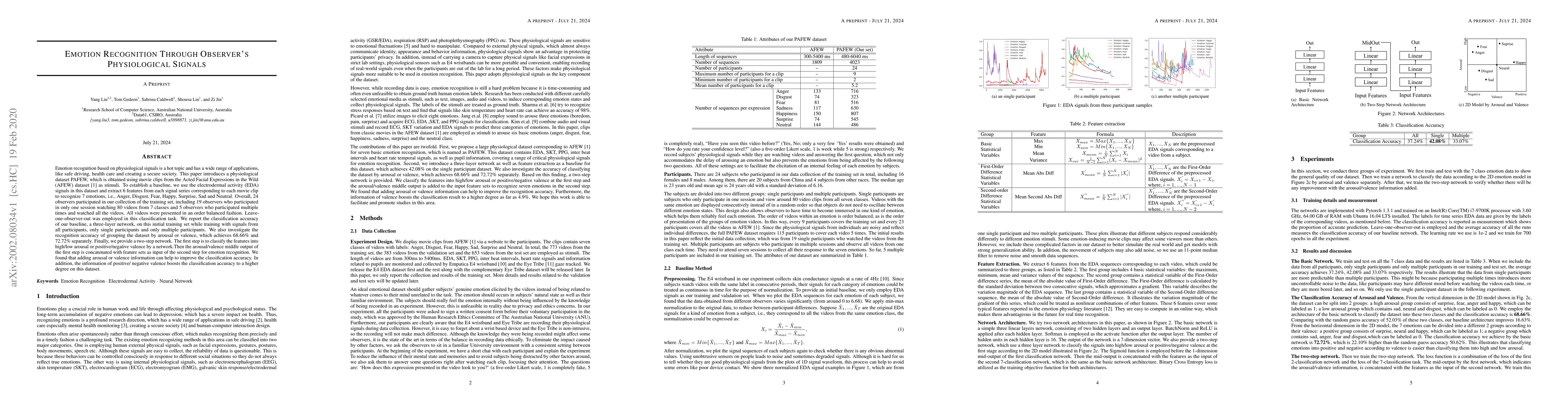 Emotion recognition based on physiological signals is a hot topic and has a wide range of applications, like safe driving, health care and creating a secure society. This paper introduces a physiological dataset PAFEW, which is obtained using movie clips from the Acted Facial Expressions in the Wild (AFEW) dataset as stimuli. To establish a baseline, we use the electrodermal activity (EDA) signals in this dataset and extract 6 features from each signal series corresponding to each movie clip to recognize 7 emotions, i.e., Anger, Disgust, Fear, Happy, Surprise, Sad and Neutral. Overall, 24 observers participated in our collection of the training set, including 19 observers who participated in only one session watching 80 videos from 7 classes and 5 observers who participated multiple times and watched all the videos. All videos were presented in an order balanced fashion. Leave-one-observer-out was employed in this classification task. We report the classification accuracy of our baseline, a three-layer network, on this initial training set while training with signals from all participants, only single participants and only multiple participants. We also investigate the recognition accuracy of grouping the dataset by arousal or valence, which achieves 68.66% and 72.72% separately. Finally, we provide a two-step network. The first step is to classify the features into high/low arousal or positive/negative valence by a network. Then the arousal/valence middle output of the first step is concatenated with feature sets as input of the second step for emotion recognition. We found that adding arousal or valence information can help to improve the classification accuracy. In addition, the information of positive/negative valence boosts the classification accuracy to a higher degree on this dataset.