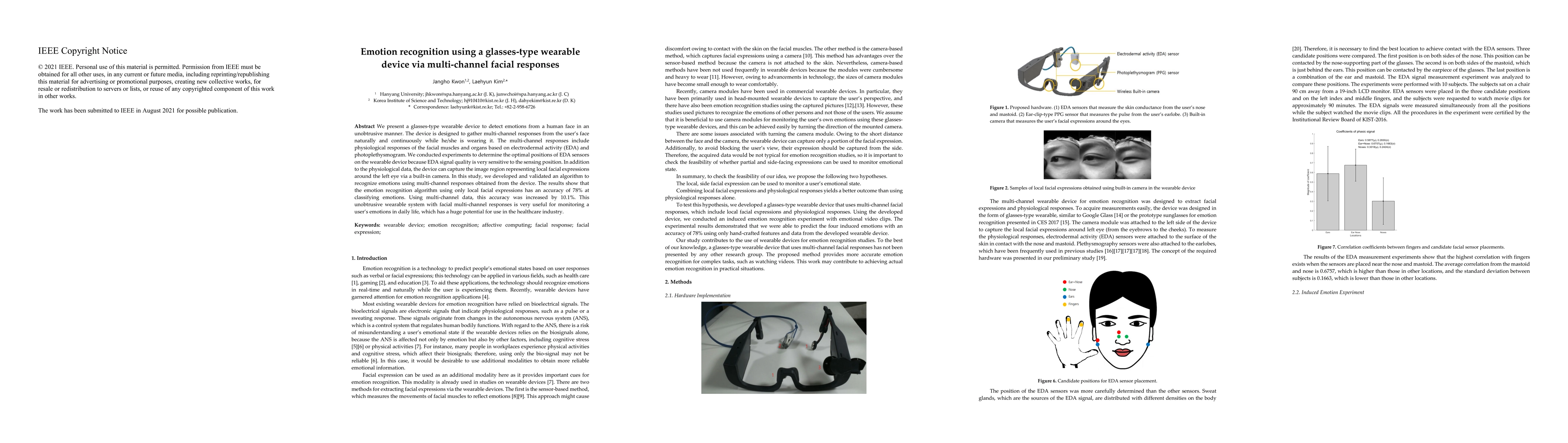We present a glasses type wearable device to detect emotions from a human face in an unobtrusive manner. The device is designed to gather multi channel responses from the user face naturally and continuously while the user is wearing it. The multi channel responses include physiological responses of the facial muscles and organs based on electrodermal activity (EDA) and photoplethysmogram. We conducted experiments to determine the optimal positions of EDA sensors on the wearable device because EDA signal quality is very sensitive to the sensing position. In addition to the physiological data, the device can capture the image region representing local facial expressions around the left eye via a built in camera. In this study, we developed and validated an algorithm to recognize emotions using multi channel responses obtained from the device. The results show that the emotion recognition algorithm using only local facial expressions has an accuracy of 78 percent at classifying emotions. Using multi channel data, this accuracy was increased by 10.1 percent. This unobtrusive wearable system with facial multi channel responses is very useful for monitoring a user emotions in daily life, which has a huge potential for use in the healthcare industry.