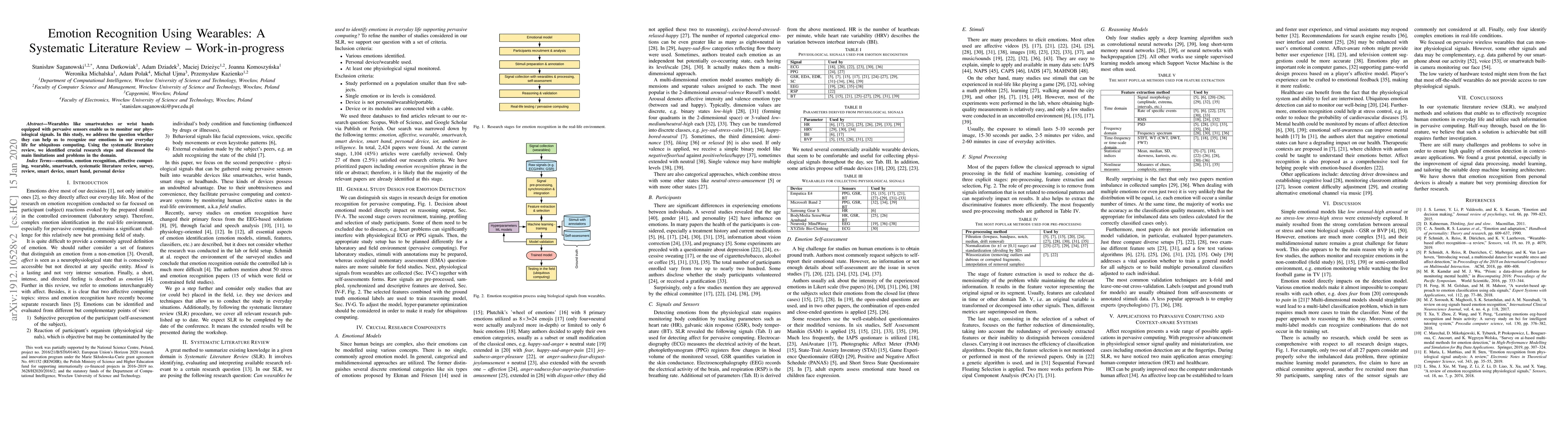 Wearables like smartwatches or wrist bands equipped with pervasive sensors enable us to monitor our physiological signals. In this study, we address the question whether they can help us to recognize our emotions in our everyday life for ubiquitous computing. Using the systematic literature review, we identified crucial research steps and discussed the main limitations and problems in the domain.