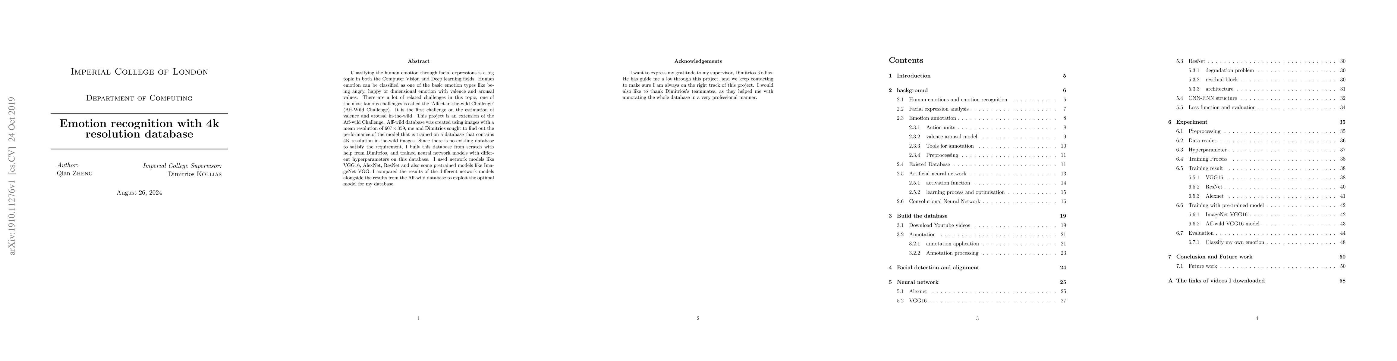 This paper explores emotion recognition using a newly created 4K resolution database, extending the Affect-in-the-wild Challenge. It trains various neural network models, including VGG16, AlexNet, and ResNet, to determine the best performing model for high-resolution in-the-wild images.
