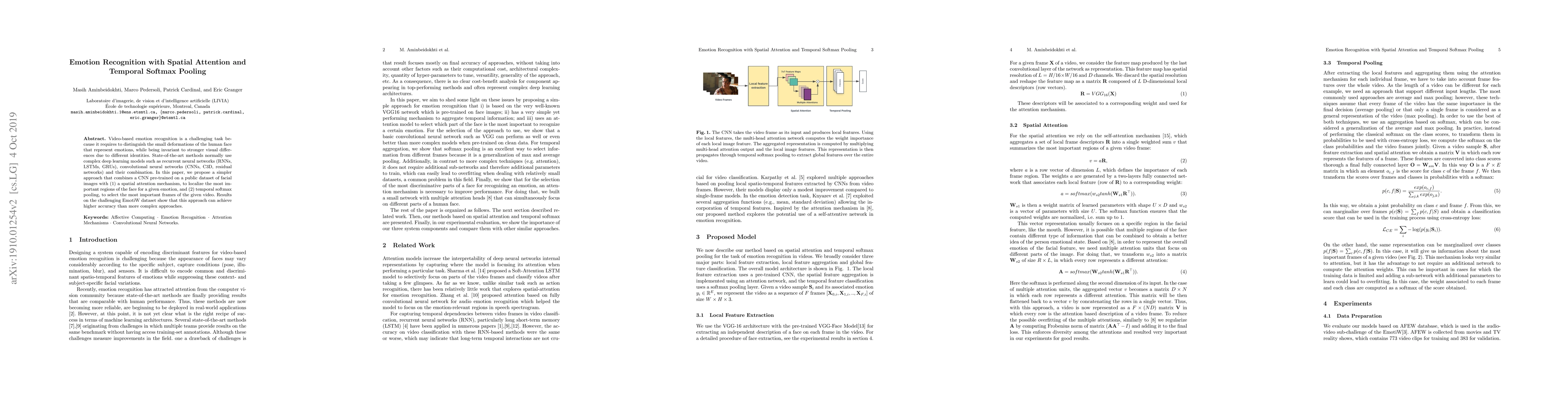 This paper proposes a simplified emotion recognition method using a CNN with spatial attention and temporal softmax pooling, achieving higher accuracy on the EmotiW dataset than complex deep learning models. The approach focuses on important facial regions and video frames to enhance recognition.