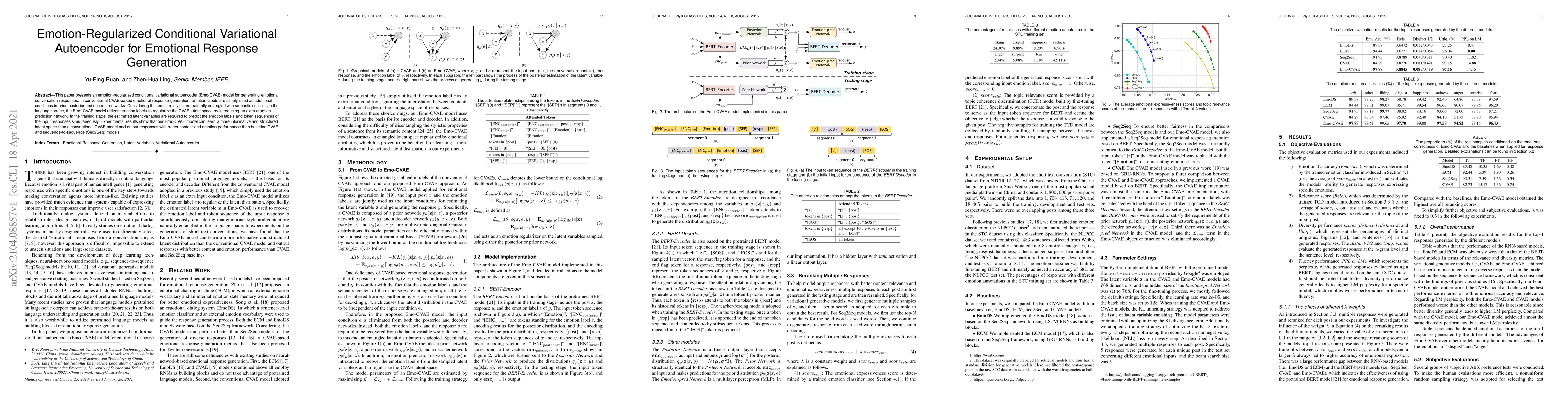 This paper introduces an emotion-regularized conditional variational autoencoder (Emo-CVAE) to generate emotional conversation responses, enhancing the latent space with an emotion prediction network. Experimental results demonstrate that Emo-CVAE outperforms conventional CVAE and Seq2Seq models in both content and emotional coherence.