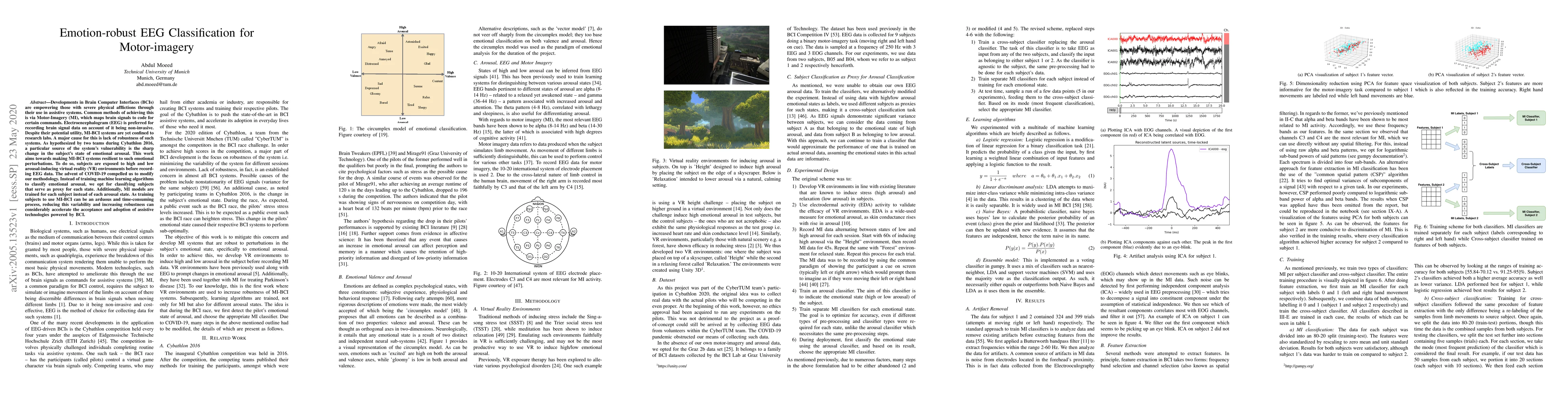 Developments in Brain Computer Interfaces (BCIs) are empowering those with severe physical afflictions through their use in assistive systems. Common methods of achieving this is via Motor Imagery (MI), which maps brain signals to code for certain commands. Electroencephalogram (EEG) is preferred for recording brain signal data on account of it being non-invasive. Despite their potential utility, MI-BCI systems are yet confined to research labs. A major cause for this is lack of robustness of such systems. As hypothesized by two teams during Cybathlon 2016, a particular source of the system's vulnerability is the sharp change in the subject's state of emotional arousal. This work aims towards making MI-BCI systems resilient to such emotional perturbations. To do so, subjects are exposed to high and low arousal-inducing virtual reality (VR) environments before recording EEG data. The advent of COVID-19 compelled us to modify our methodology. Instead of training machine learning algorithms to classify emotional arousal, we opt for classifying subjects that serve as proxy for each state. Additionally, MI models are trained for each subject instead of each arousal state. As training subjects to use MI-BCI can be an arduous and time-consuming process, reducing this variability and increasing robustness can considerably accelerate the acceptance and adoption of assistive technologies powered by BCI.