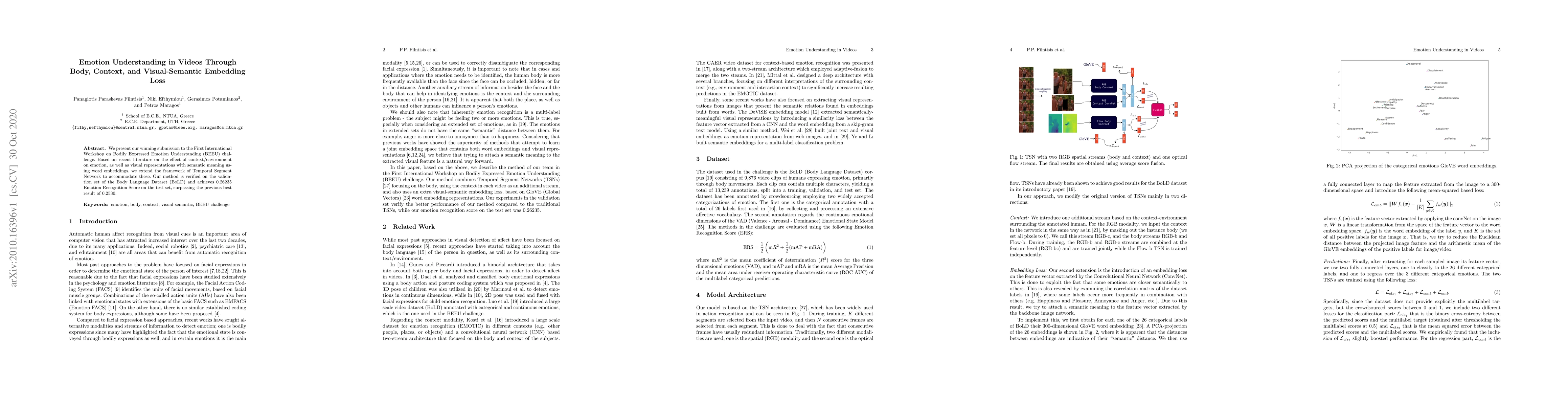 We present our winning submission to the First International Workshop on Bodily Expressed Emotion Understanding (BEEU) challenge. Based on recent literature on the effect of context/environment on emotion, as well as visual representations with semantic meaning using word embeddings, we extend the framework of Temporal Segment Network to accommodate these. Our method is verified on the validation set of the Body Language Dataset (BoLD) and achieves 0.26235 Emotion Recognition Score on the test set, surpassing the previous best result of 0.2530.