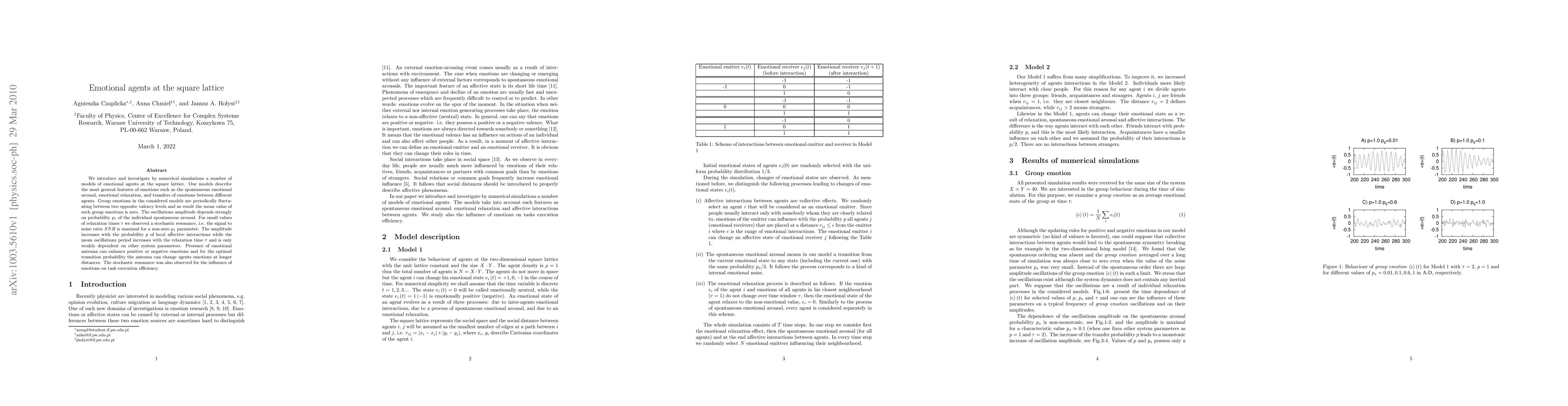 Researchers created models of emotional agents at a square lattice, finding that stochastic resonance occurs when emotions fluctuate between positive and negative states, with parameters like relaxation time and interaction probability influencing the outcome.