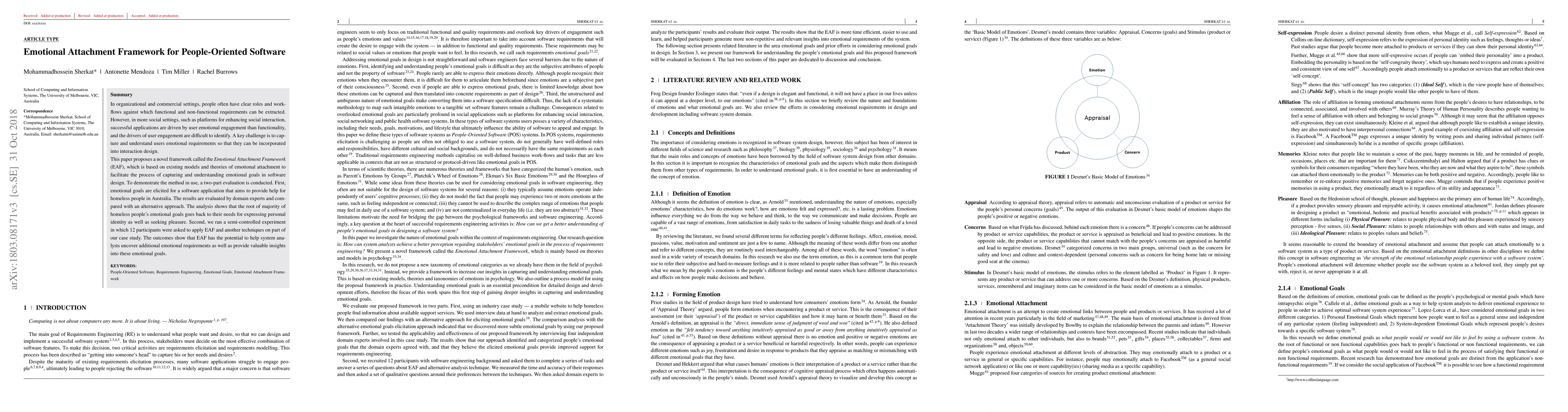 In organizational and commercial settings, people often have clear roles and workflows against which functional and non-functional requirements can be extracted. However, in more social settings, such as platforms for enhancing social interaction, successful applications are driven more by using emotional engagement than functionality, and the drivers of user engagement are difficult to identify. A key challenge is to understand people's emotional goals so that they can be incorporated into the design. This paper proposes a novel framework called the Emotional Attachment Framework, which is based on existing models and theories of emotional attachment. Its aim is to facilitate the process of getting a deeper insight into emotional goals in software engineering. To demonstrate the framework in use, emotional goals are elicited for a software application that aims to provide help for homeless people. To measure the effectiveness and efficiency of the proposed technique in this study, a series of evaluations are undertaken: a semi-controlled experiment, a comparison analysis, and domain expert and end-user evaluation. The results indicate that the Emotional Attachment Framework has the potential to give better insight during analysis of emotional goals.