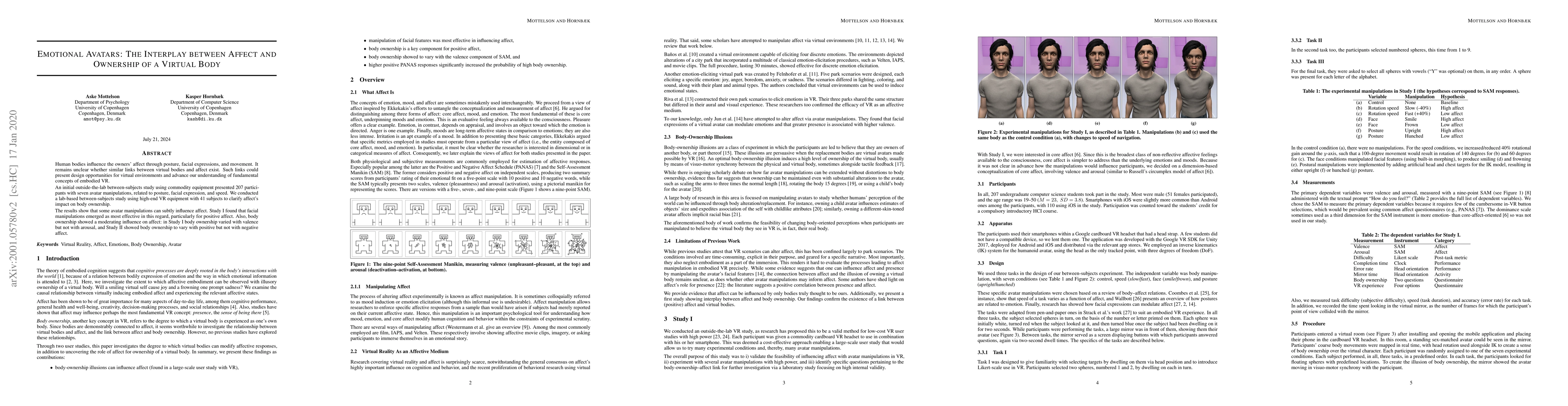 Research explores how virtual bodies influence affect in users, finding that facial manipulations have a significant impact on positive emotions, while body ownership plays a role in modulating both positive and negative emotions.
