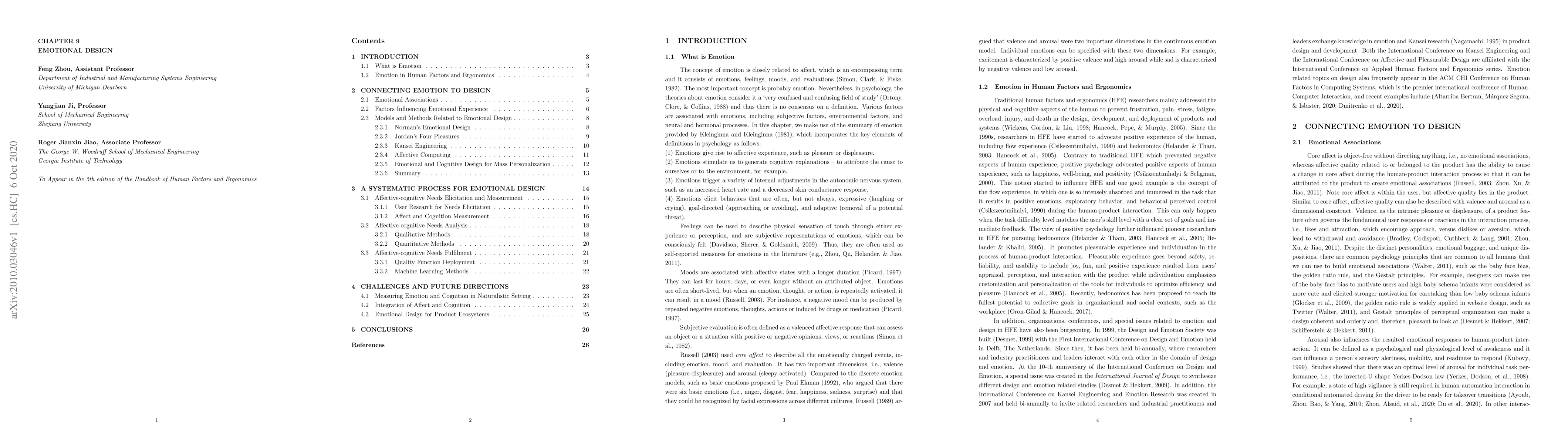 Emotional design has been well recognized in the domain of human factors and ergonomics. In this chapter, we reviewed related models and methods of emotional design. We are motivated to encourage emotional designers to take multiple perspectives when examining these models and methods. Then we proposed a systematic process for emotional design, including affective-cognitive needs elicitation, affective-cognitive needs analysis, and affective-cognitive needs fulfillment to support emotional design. Within each step, we provided an updated review of the representative methods to support and offer further guidance on emotional design. We hope researchers and industrial practitioners can take a systematic approach to consider each step in the framework with care. Finally, the speculations on the challenges and future directions can potentially help researchers across different fields to further advance emotional design.