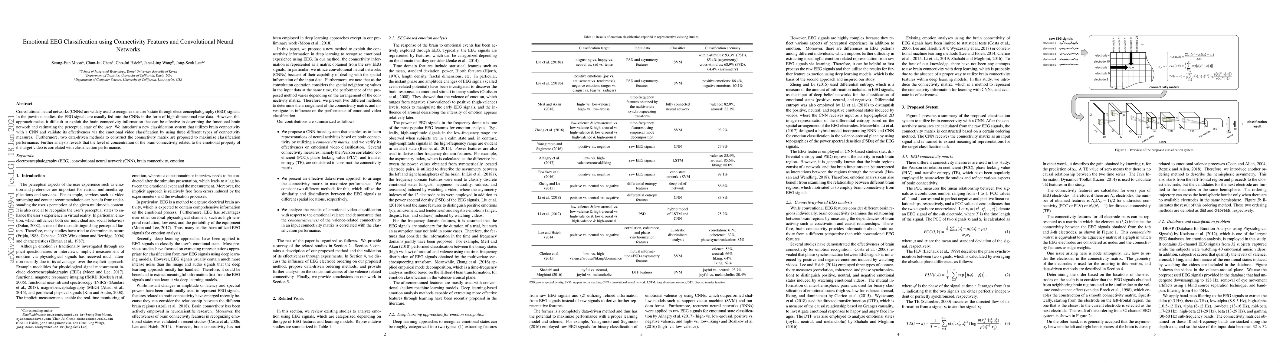 This paper proposes a novel EEG classification system that integrates brain connectivity features with convolutional neural networks (CNNs) to enhance emotional state recognition. The study validates the effectiveness of this approach through emotional video classification using various connectivity measures.