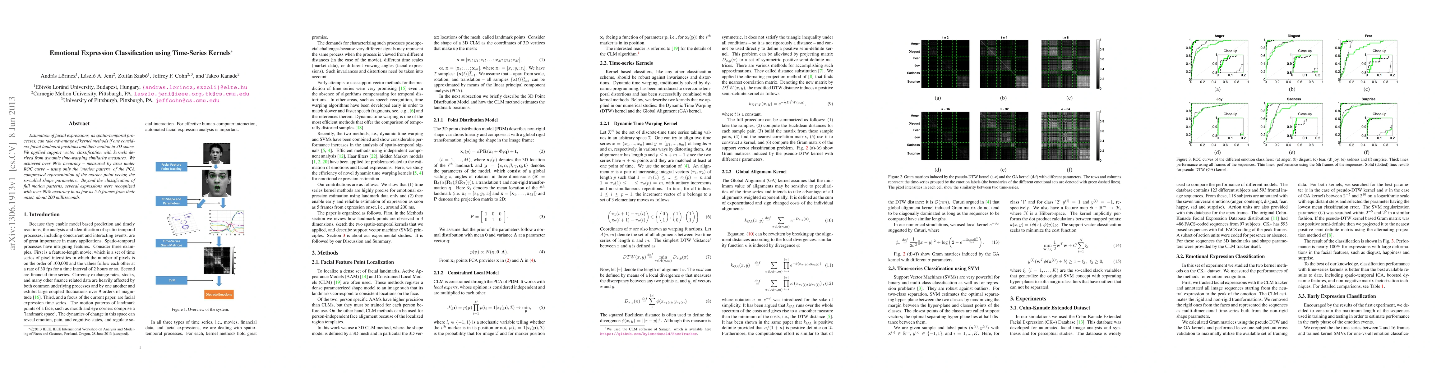 Estimation of facial expressions, as spatio-temporal processes, can take advantage of kernel methods if one considers facial landmark positions and their motion in 3D space. We applied support vector classification with kernels derived from dynamic time-warping similarity measures. We achieved over 99% accuracy - measured by area under ROC curve - using only the 'motion pattern' of the PCA compressed representation of the marker point vector, the so-called shape parameters. Beyond the classification of full motion patterns, several expressions were recognized with over 90% accuracy in as few as 5-6 frames from their onset, about 200 milliseconds.