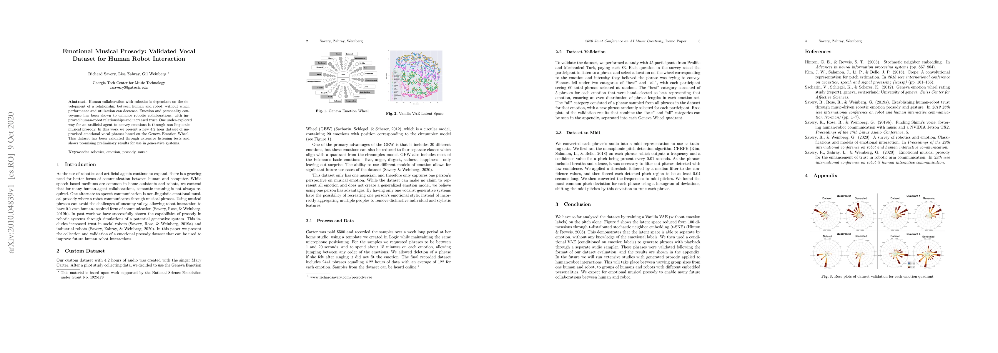 Human collaboration with robotics is dependant on the development of a relationship between human and robot, without which performance and utilization can decrease. Emotion and personality conveyance has been shown to enhance robotic collaborations, with improved human-robot relationships and increased trust. One under-explored way for an artificial agent to convey emotions is through non-linguistic musical prosody. In this work we present a new 4.2 hour dataset of improvised emotional vocal phrases based on the Geneva Emotion Wheel. This dataset has been validated through extensive listening tests and shows promising preliminary results for use in generative systems.