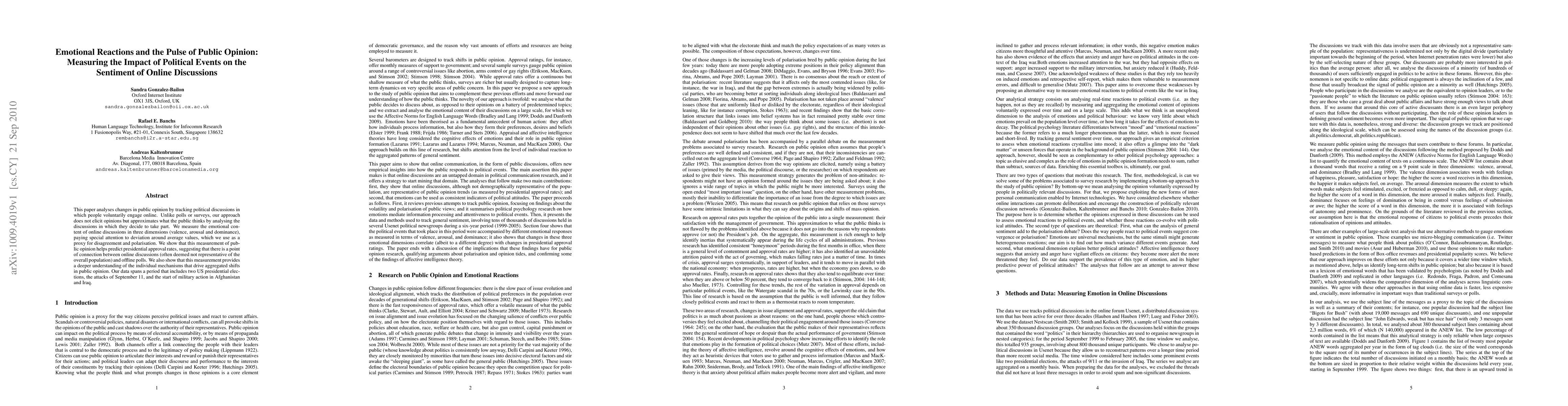 This paper measures emotional reactions in online political discussions to gauge public opinion shifts, finding a connection between these sentiments and presidential approval rates. It highlights how deviations in emotional content can indicate disagreement and polarization, offering insights into the mechanisms behind public opinion changes.