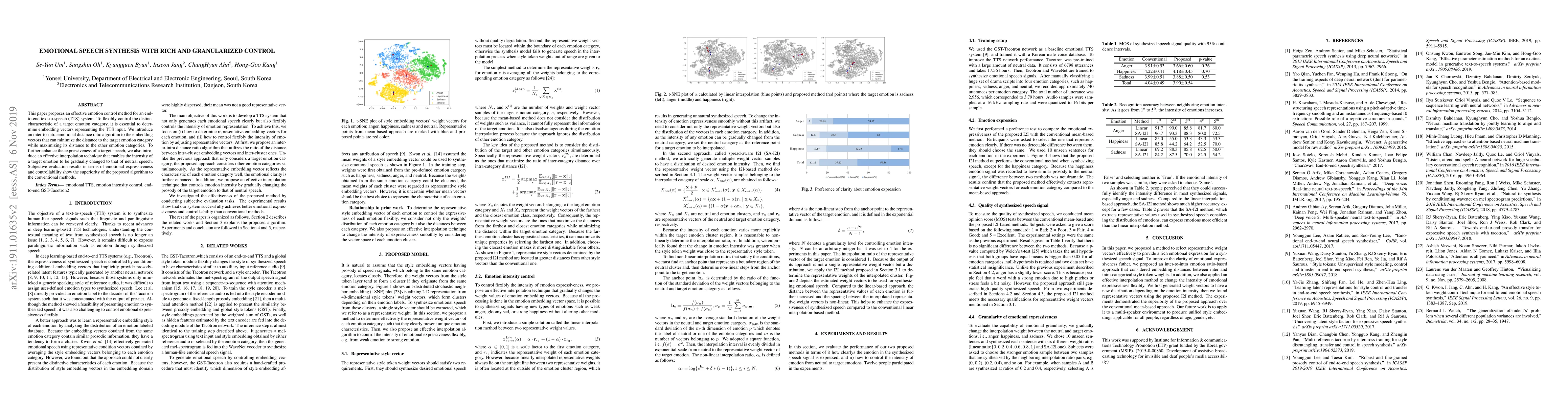 This paper proposes an effective emotion control method for an end-to-end text-to-speech (TTS) system. To flexibly control the distinct characteristic of a target emotion category, it is essential to determine embedding vectors representing the TTS input. We introduce an inter-to-intra emotional distance ratio algorithm to the embedding vectors that can minimize the distance to the target emotion category while maximizing its distance to the other emotion categories. To further enhance the expressiveness of a target speech, we also introduce an effective interpolation technique that enables the intensity of a target emotion to be gradually changed to that of neutral speech. Subjective evaluation results in terms of emotional expressiveness and controllability show the superiority of the proposed algorithm to the conventional methods.