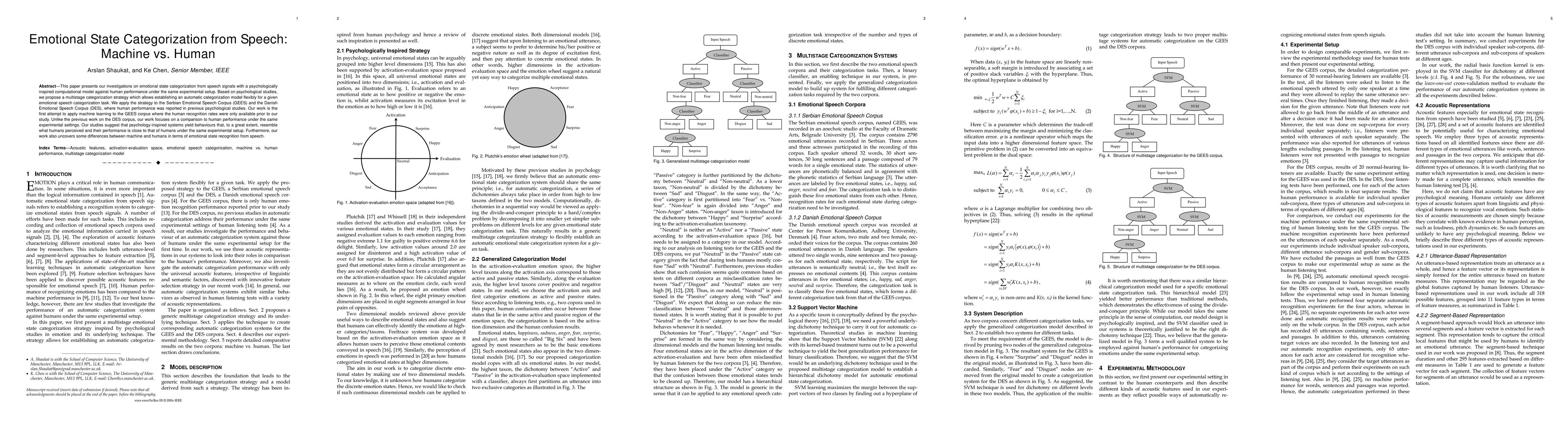 This paper compares machine learning models inspired by psychological theories to human performance in categorizing emotional states from speech, finding that while machines can closely mimic human recognition, there are notable differences in their approaches. The study applies the model to two emotional speech corpora and highlights the strengths and limitations of machine versus human emotional state detection.