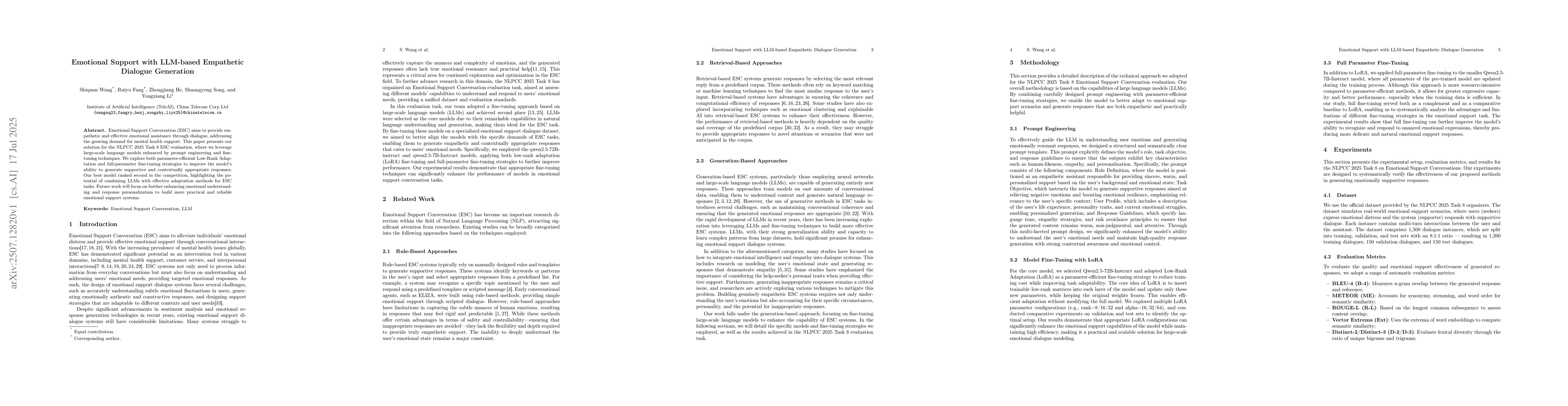 Emotional Support Conversation (ESC) aims to provide empathetic and effective emotional assistance through dialogue, addressing the growing demand for mental health support. This paper presents our solution for the NLPCC 2025 Task 8 ESC evaluation, where we leverage large-scale language models enhanced by prompt engineering and finetuning techniques. We explore both parameter-efficient Low-Rank Adaptation and full-parameter fine-tuning strategies to improve the model's ability to generate supportive and contextually appropriate responses. Our best model ranked second in the competition, highlighting the potential of combining LLMs with effective adaptation methods for ESC tasks. Future work will focus on further enhancing emotional understanding and response personalization to build more practical and reliable emotional support systems.