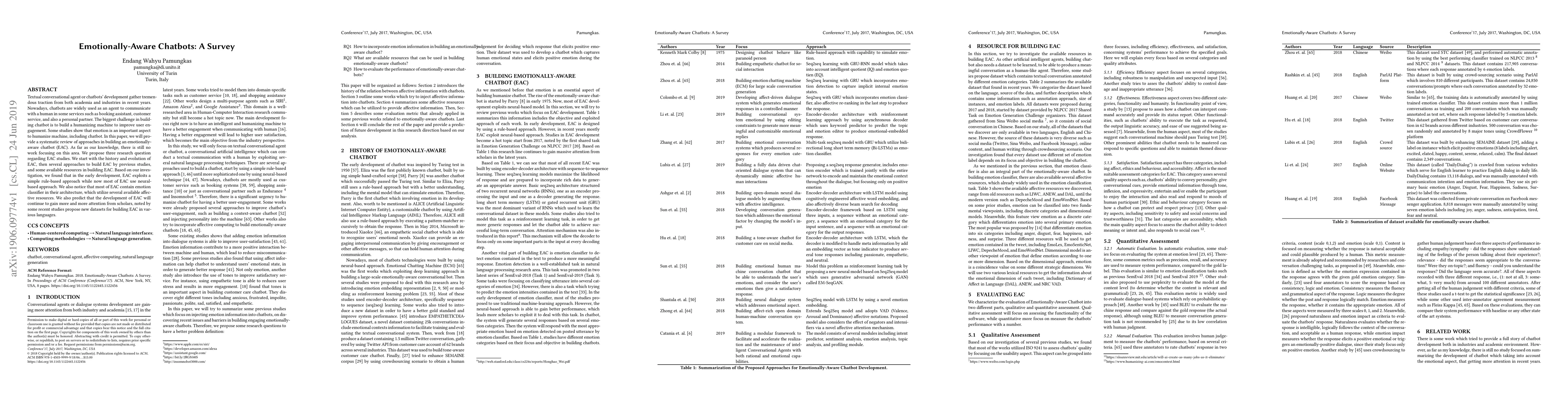 This research paper provides a systematic review of approaches to building emotionally-aware chatbots (EACs), highlighting the evolution from simple rule-based approaches to neural-based methods, with most EACs now incorporating emotion classifiers.