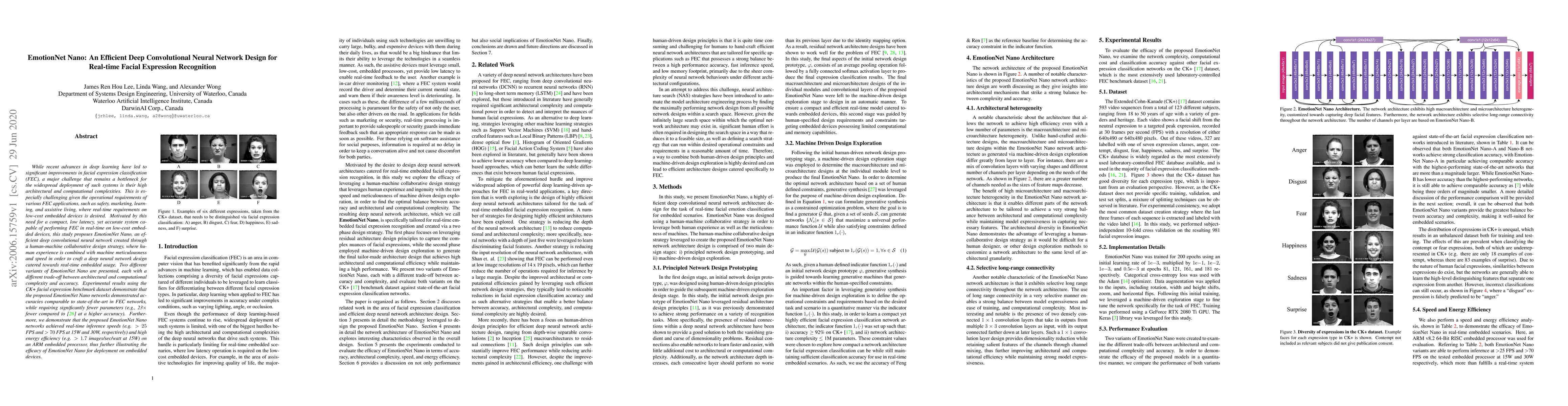 EmotionNet Nano presents an efficient deep convolutional neural network designed for real-time facial expression recognition on low-cost embedded devices, balancing accuracy with reduced computational complexity and energy efficiency. Experimental results show it achieves state-of-the-art accuracy with significantly fewer parameters and high real-time inference speeds.