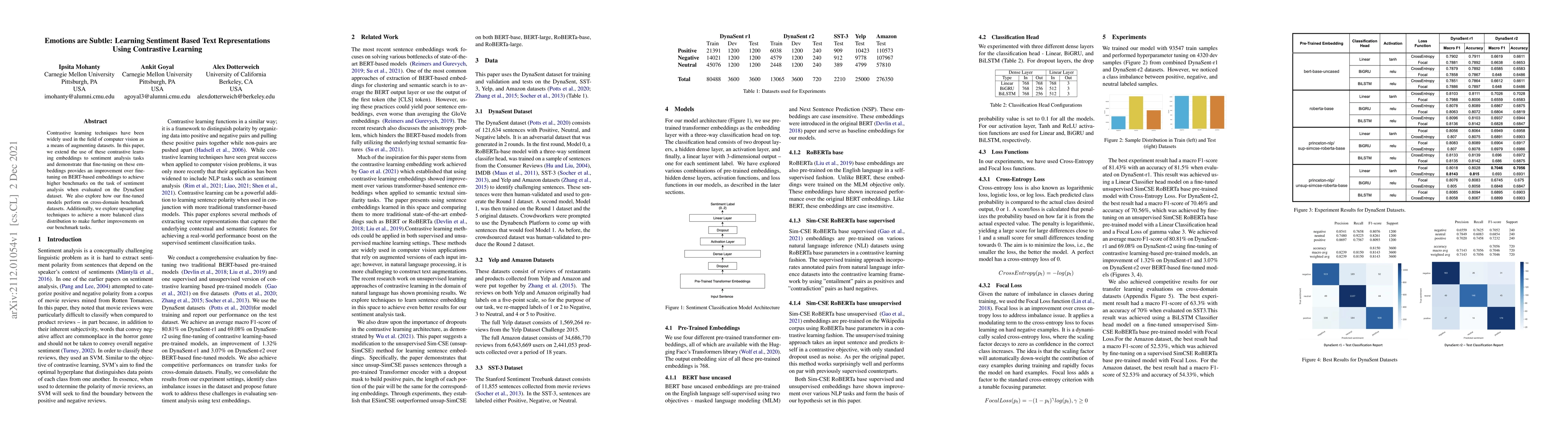 Contrastive learning techniques have been widely used in the field of computer vision as a means of augmenting datasets. In this paper, we extend the use of these contrastive learning embeddings to sentiment analysis tasks and demonstrate that fine-tuning on these embeddings provides an improvement over fine-tuning on BERT-based embeddings to achieve higher benchmarks on the task of sentiment analysis when evaluated on the DynaSent dataset. We also explore how our fine-tuned models perform on cross-domain benchmark datasets. Additionally, we explore upsampling techniques to achieve a more balanced class distribution to make further improvements on our benchmark tasks.