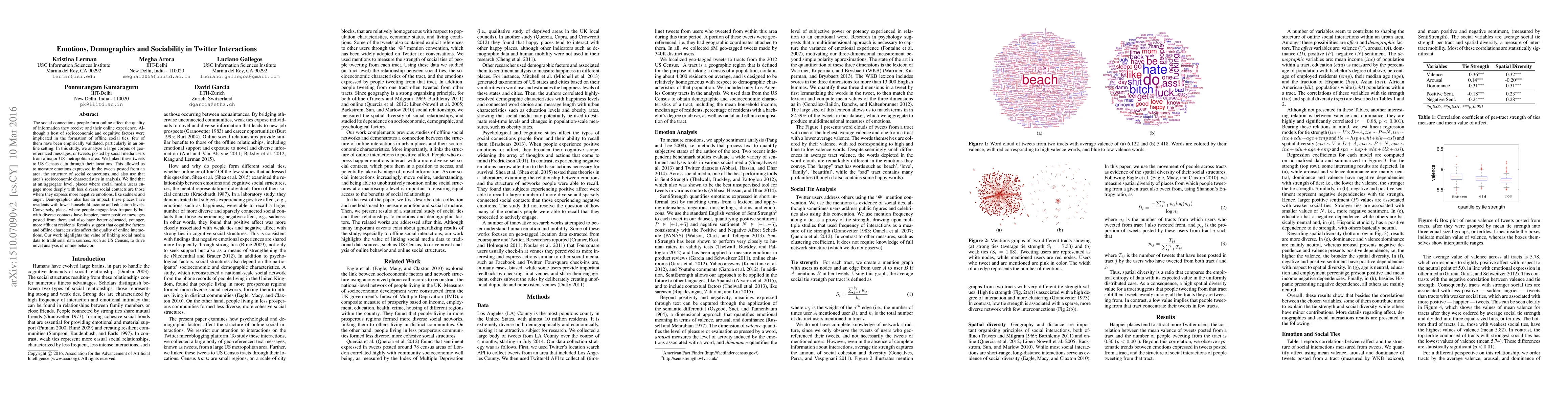 The social connections people form online affect the quality of information they receive and their online experience. Although a host of socioeconomic and cognitive factors were implicated in the formation of offline social ties, few of them have been empirically validated, particularly in an online setting. In this study, we analyze a large corpus of geo-referenced messages, or tweets, posted by social media users from a major US metropolitan area. We linked these tweets to US Census data through their locations. This allowed us to measure emotions expressed in the tweets posted from an area, the structure of social connections, and also use that area's socioeconomic characteristics in analysis. %We extracted the structure of online social interactions from the people mentioned in tweets from that area. We find that at an aggregate level, places where social media users engage more deeply with less diverse social contacts are those where they express more negative emotions, like sadness and anger. Demographics also has an impact: these places have residents with lower household income and education levels. Conversely, places where people engage less frequently but with diverse contacts have happier, more positive messages posted from them and also have better educated, younger, more affluent residents. Results suggest that cognitive factors and offline characteristics affect the quality of online interactions. Our work highlights the value of linking social media data to traditional data sources, such as US Census, to drive novel analysis of online behavior.