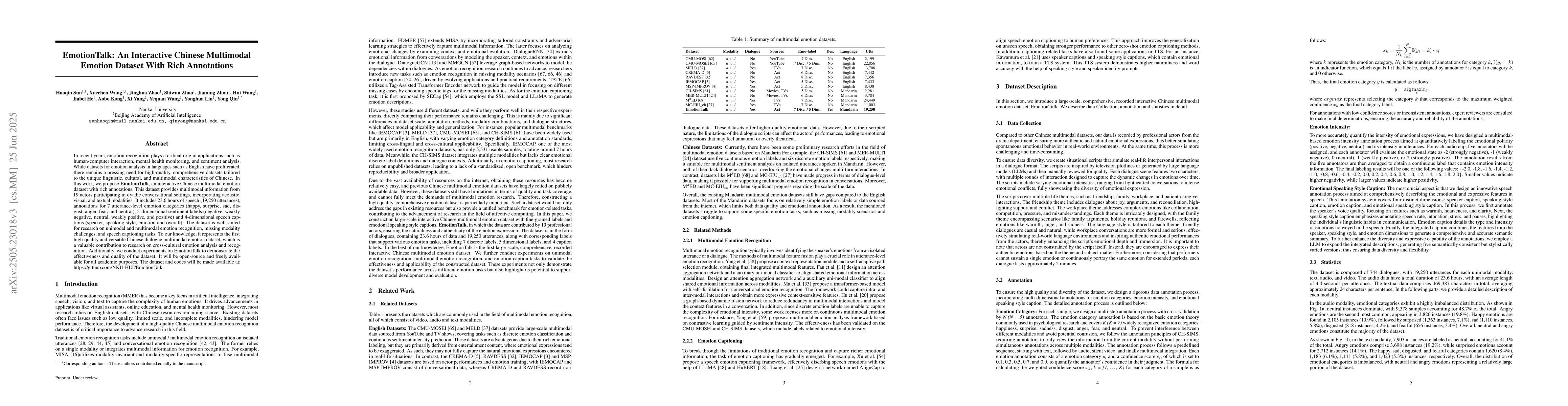 The paper proposes EmotionTalk, an interactive Chinese multimodal emotion dataset with rich annotations, collected from 19 actors in dyadic conversational settings, incorporating acoustic, visual, and textual modalities.
