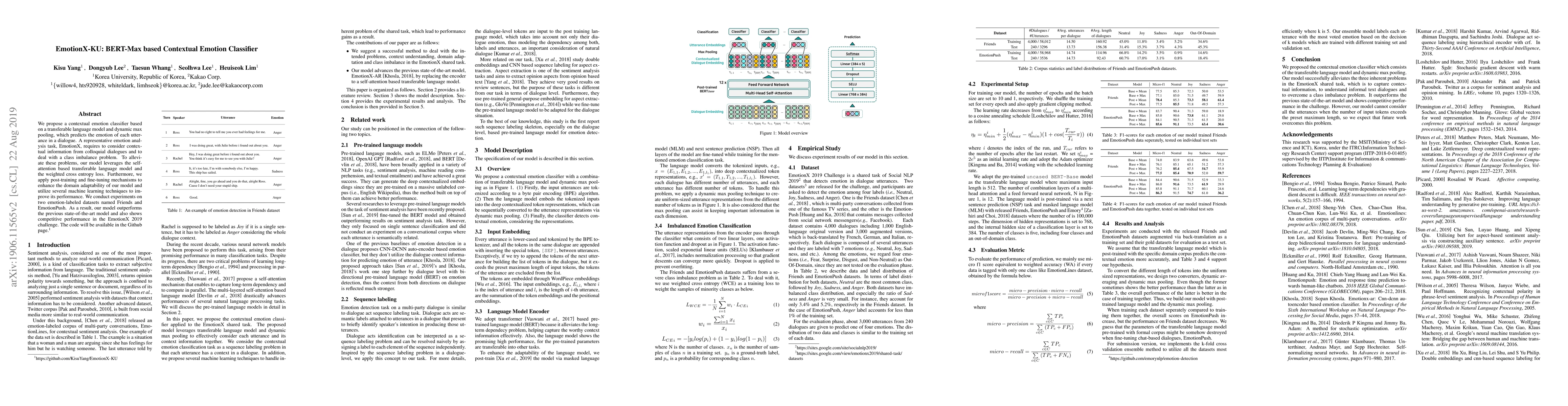We propose a contextual emotion classifier based on a transferable language model and dynamic max pooling, which predicts the emotion of each utterance in a dialogue. A representative emotion analysis task, EmotionX, requires to consider contextual information from colloquial dialogues and to deal with a class imbalance problem. To alleviate these problems, our model leverages the self-attention based transferable language model and the weighted cross entropy loss. Furthermore, we apply post-training and fine-tuning mechanisms to enhance the domain adaptability of our model and utilize several machine learning techniques to improve its performance. We conduct experiments on two emotion-labeled datasets named Friends and EmotionPush. As a result, our model outperforms the previous state-of-the-art model and also shows competitive performance in the EmotionX 2019 challenge. The code will be available in the Github page.