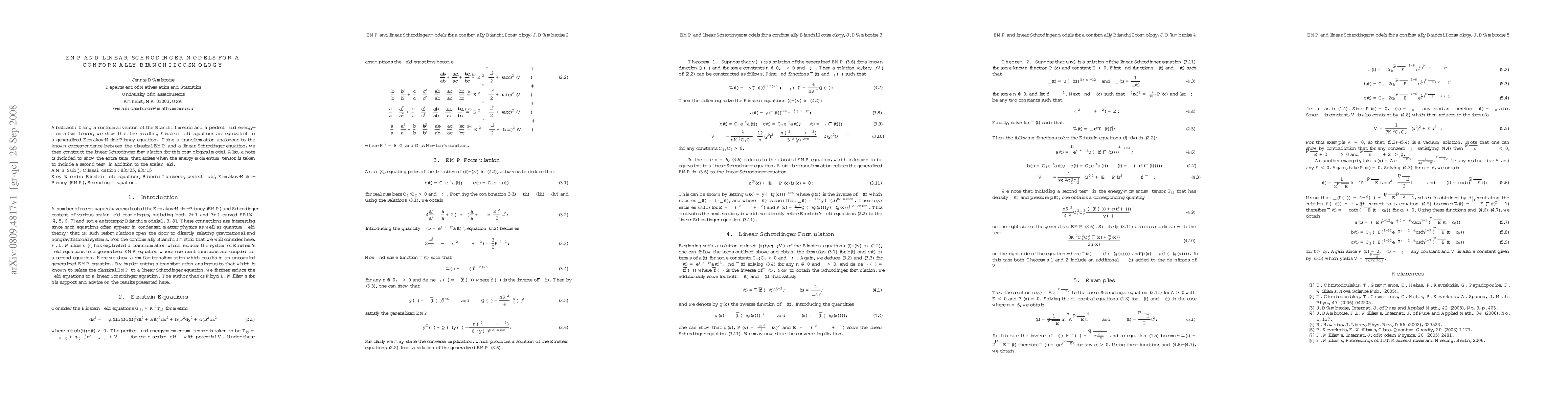 Using a conformal version of the Bianchi I metric and a perfect fluid energy-momentum tensor, we show that the resulting Einstein field equations are equivalent to a generalized Ermakov-Milne-Pinney equation. Using a transformation analogous to the known correspondence between the classical EMP and a linear Schr\"odinger equation, we then construct the linear Schr\"odinger formulation for this cosmological model. Also, a note is included to show the extra term that arises when the energy-momentum tensor is taken to include a second term in addition to the scalar field.