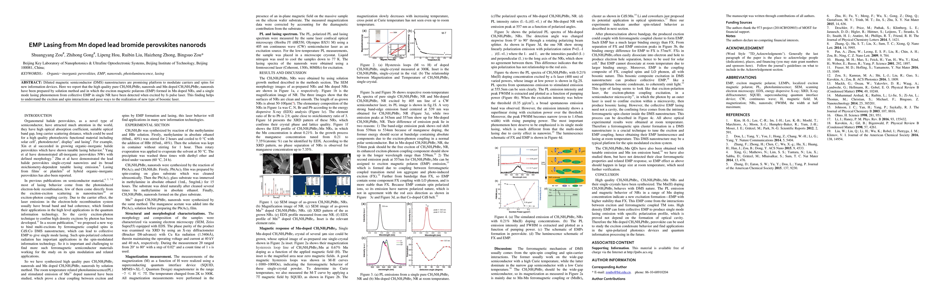 Diluted magnetic semiconductor (DMS) nanostructures are promising platform to modulate carriers and spins for new information devices. Here we report that the high quality pure CH3NH3PbBr3 nanorods and Mn doped CH3NH3PbBr3 nanorods have been prepared by solution method and in which the exciton magnetic polarons (EMP) formed in Mn doped NRs, and a single mode lasing phenomenon from collective EMP in single NR have been detected when excited by fs pulse laser. This finding helps to understand the exciton and spin interactions and pave ways to the realization of new type of bosonic laser.
