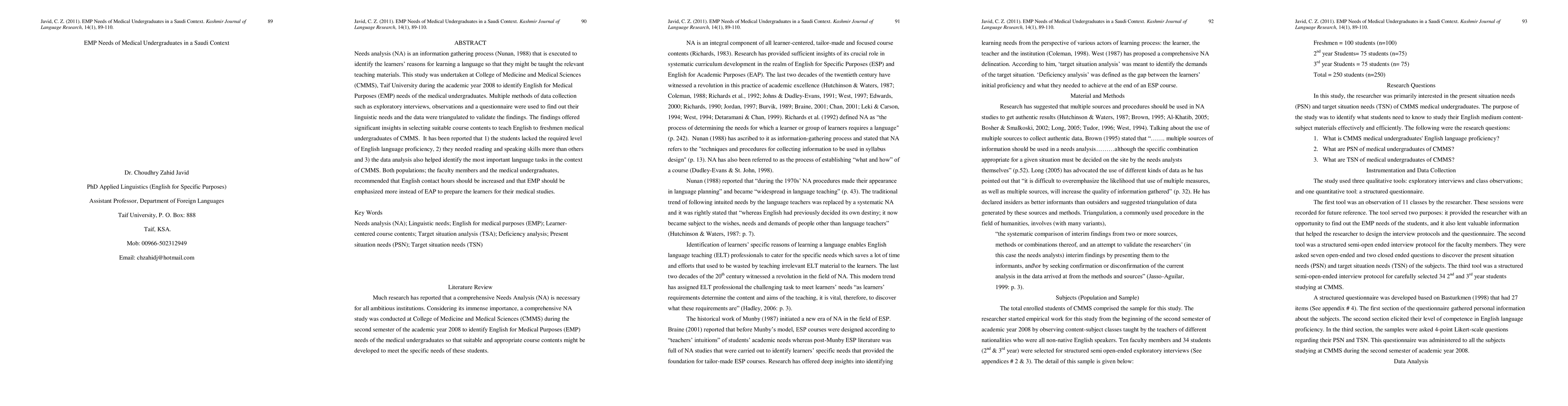 Needs analysis (NA) is an information gathering process (Nunan 1988) that is executed to identify the learners reasons for learning a language so that they might be taught the relevant teaching materials. This study was undertaken at College of Medicine and Medical Sciences (CMMS), Taif University during the academic year 2008 to identify English for Medical Purposes (EMP) needs of the medical undergraduates. Multiple methods of data collection such as exploratory interviews, observations and a questionnaire were used to find out their linguistic needs and the data were triangulated to validate the findings. The findings offered significant insights in selecting suitable course contents to teach English to freshmen medical undergraduates of CMMS. It has been reported that 1) the students lacked the required level of English language proficiency, 2) they needed reading and speaking skills more than others and 3) the data analysis also helped identify the most important language tasks in the context of CMMS. Both populations; the faculty members and the medical undergraduates, recommended that English contact hours should be increased and that EMP should be emphasized more instead of EAP to prepare the learners for their medical studies