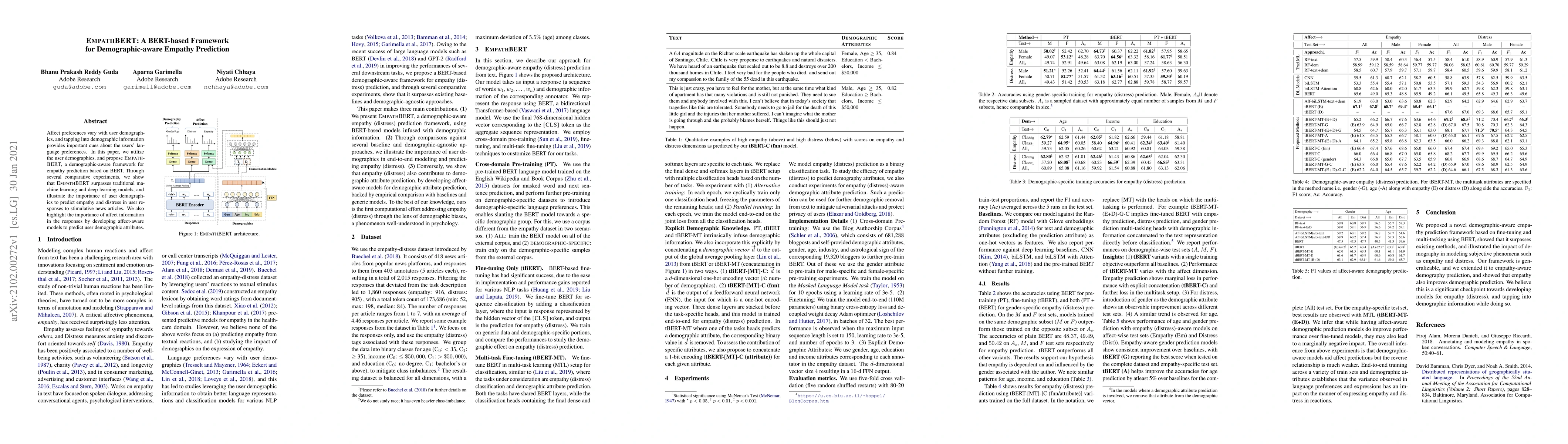 Affect preferences vary with user demographics, and tapping into demographic information provides important cues about the users' language preferences. In this paper, we utilize the user demographics, and propose EmpathBERT, a demographic-aware framework for empathy prediction based on BERT. Through several comparative experiments, we show that EmpathBERT surpasses traditional machine learning and deep learning models, and illustrate the importance of user demographics to predict empathy and distress in user responses to stimulative news articles. We also highlight the importance of affect information in the responses by developing affect-aware models to predict user demographic attributes.