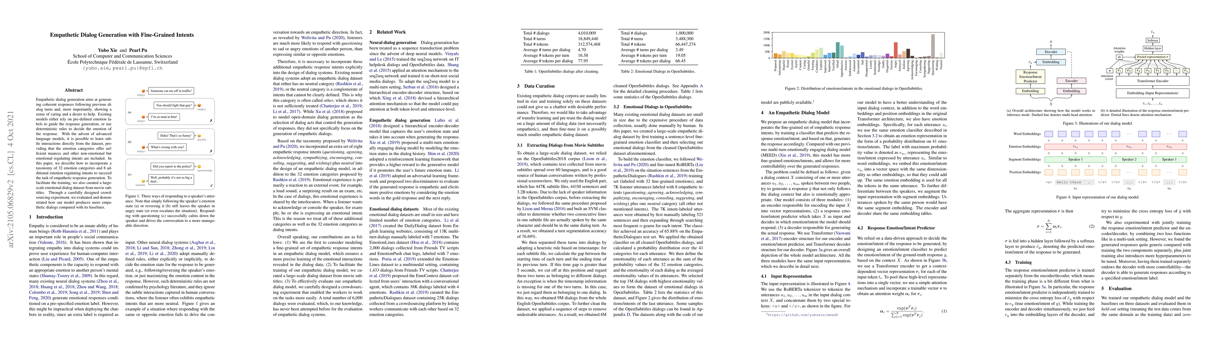 This paper proposes a method for generating empathetic dialogs by incorporating a taxonomy of 32 emotion categories and 8 emotion regulating intents. A large-scale emotional dialog dataset from movie subtitles was curated for training, and the model's effectiveness was demonstrated through a crowdsourcing experiment showing superior empathetic response generation compared to baselines.