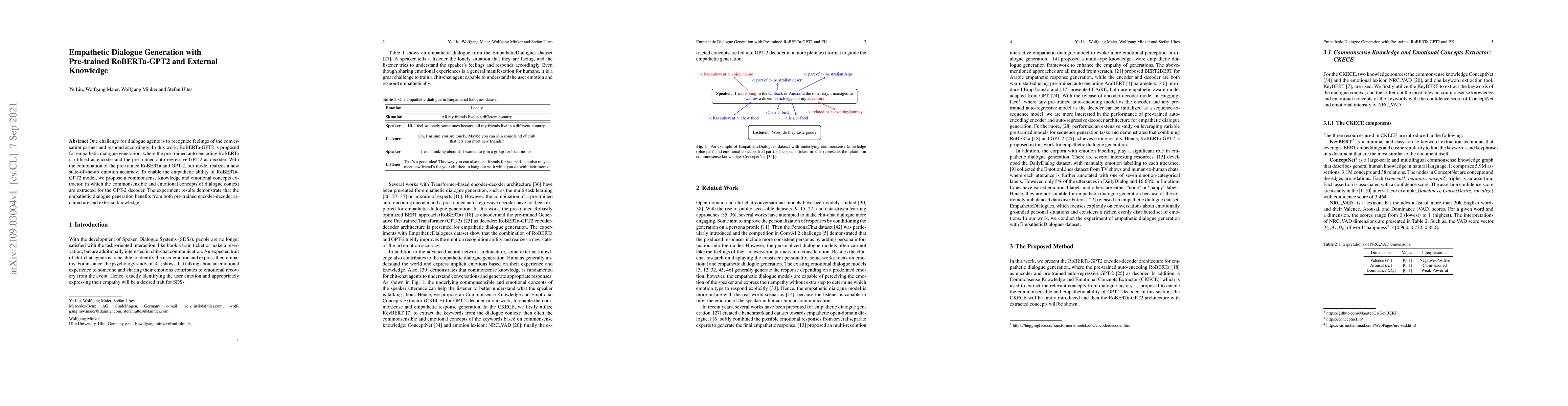 This paper proposes a RoBERTa-GPT2 model for empathetic dialogue generation, combining pre-trained encoder and decoder to achieve state-of-the-art emotion accuracy. It introduces an external knowledge extractor to enhance the model's empathetic capabilities, showing improved performance through the integration of commonsense and emotional concepts.
