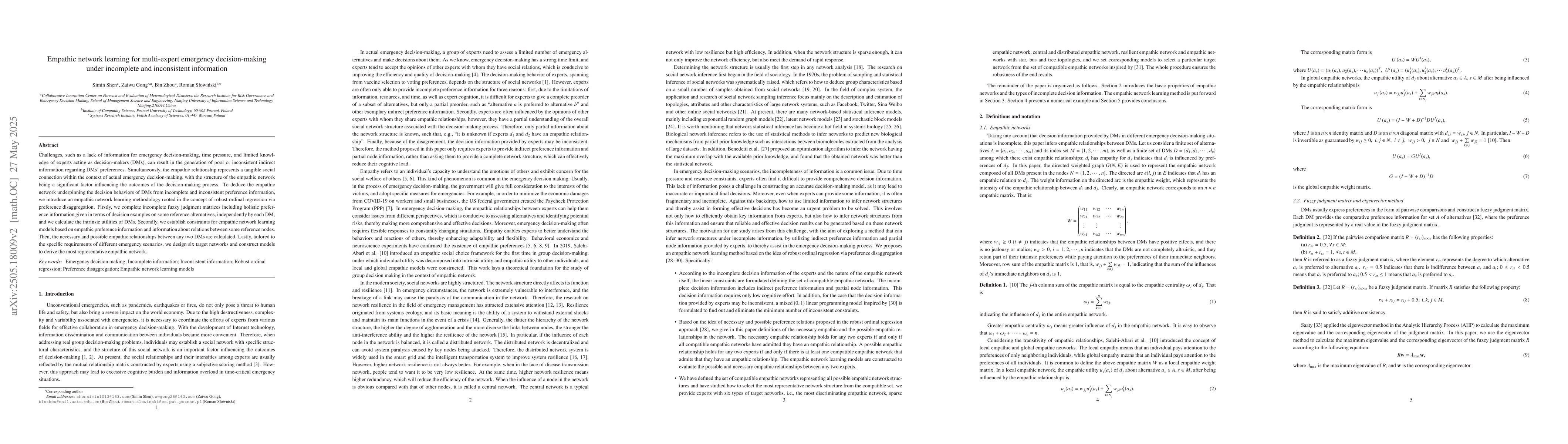 Researchers developed a method to learn empathic networks from incomplete information used in emergency decision-making, enabling more accurate decision-making under time pressure. The approach uses robust ordinal regression to infer relationships between experts based on their preferences.
