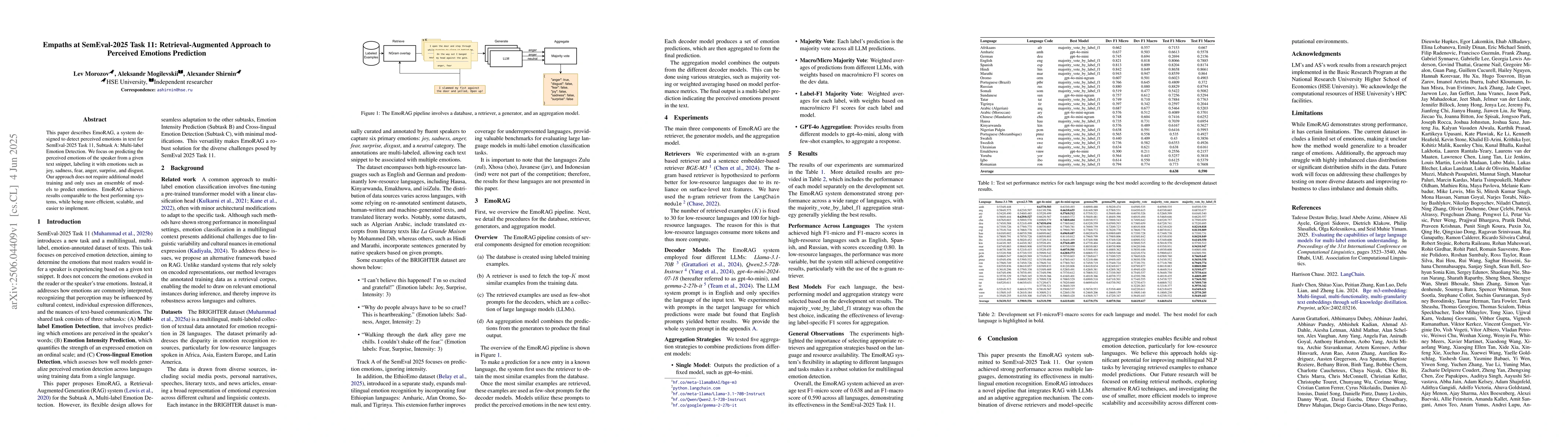 This paper describes EmoRAG, a system designed to detect perceived emotions in text for SemEval-2025 Task 11, Subtask A: Multi-label Emotion Detection. We focus on predicting the perceived emotions of the speaker from a given text snippet, labeling it with emotions such as joy, sadness, fear, anger, surprise, and disgust. Our approach does not require additional model training and only uses an ensemble of models to predict emotions. EmoRAG achieves results comparable to the best performing systems, while being more efficient, scalable, and easier to implement.