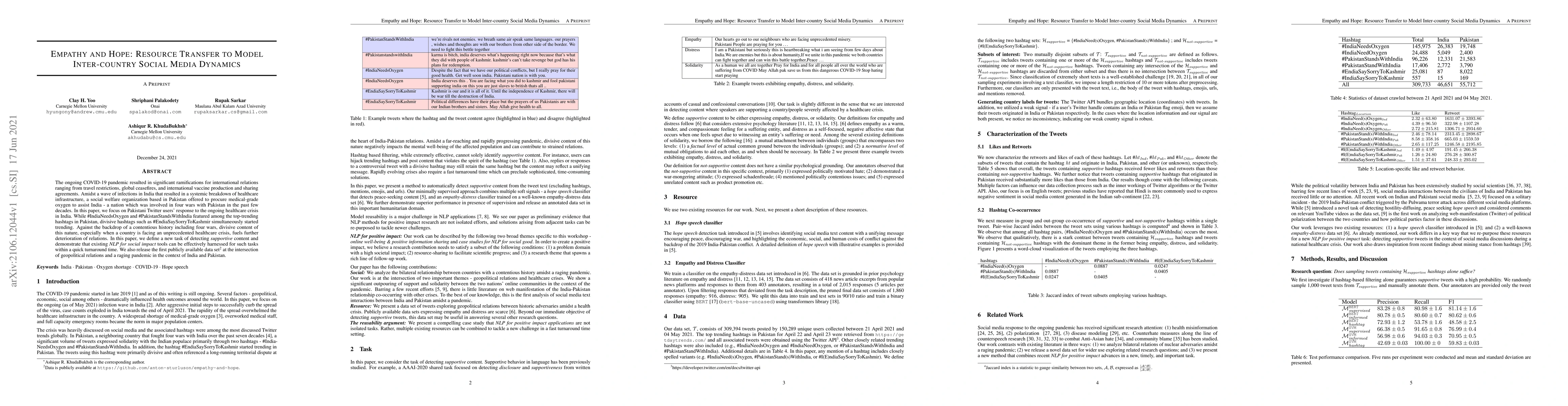 The ongoing COVID-19 pandemic resulted in significant ramifications for international relations ranging from travel restrictions, global ceasefires, and international vaccine production and sharing agreements. Amidst a wave of infections in India that resulted in a systemic breakdown of healthcare infrastructure, a social welfare organization based in Pakistan offered to procure medical-grade oxygen to assist India -- a nation which was involved in four wars with Pakistan in the past few decades. In this paper, we focus on Pakistani Twitter users' response to the ongoing healthcare crisis in India. While #IndiaNeedsOxygen and #PakistanStandsWithIndia featured among the top-trending hashtags in Pakistan, divisive hashtags such as #EndiaSaySorryToKashmir simultaneously started trending. Against the backdrop of a contentious history including four wars, divisive content of this nature, especially when a country is facing an unprecedented healthcare crisis, fuels further deterioration of relations. In this paper, we define a new task of detecting \emph{supportive} content and demonstrate that existing \emph{NLP for social impact} tools can be effectively harnessed for such tasks within a quick turnaround time. We also release the first publicly available data set at the intersection of geopolitical relations and a raging pandemic in the context of India and Pakistan.
