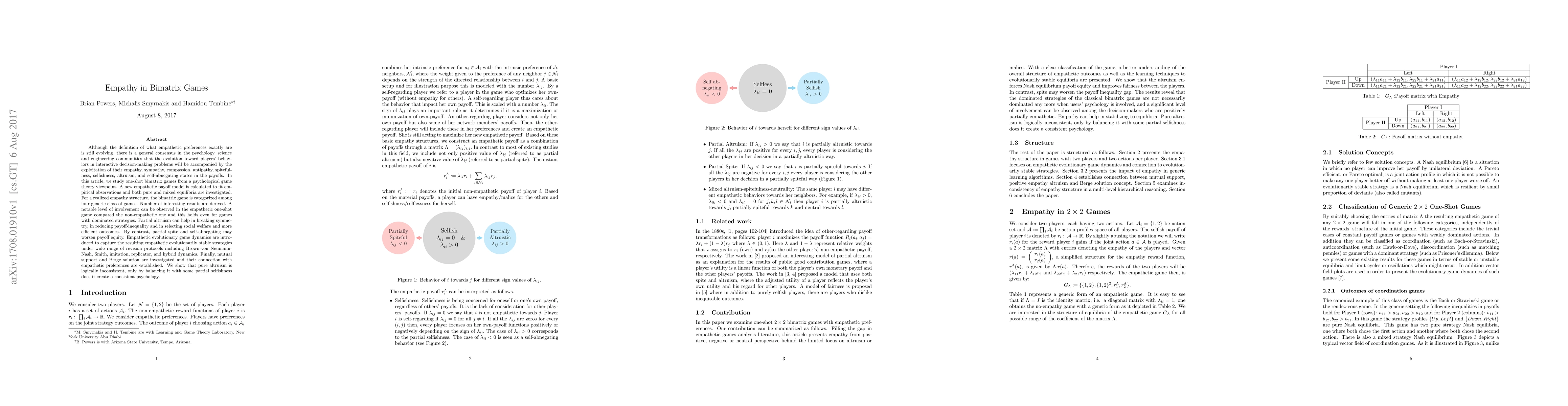 This paper explores empathy in one-shot bimatrix games, introducing a new empathetic payoff model to fit empirical observations and investigating both pure and mixed equilibria. It finds that partial altruism can lead to more efficient outcomes, while partial spite and self-abnegating behaviors may worsen payoff equity, highlighting the complex interplay of empathetic preferences in interactive decision-making.