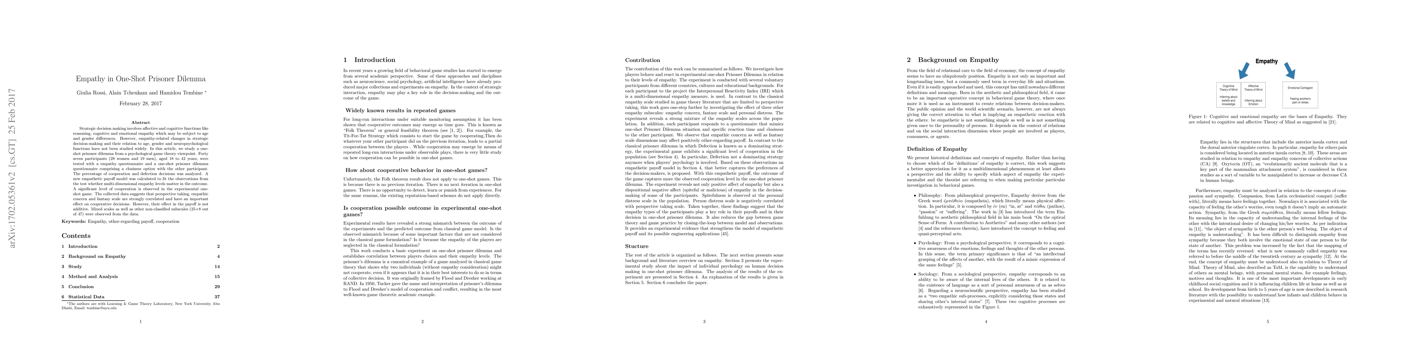 Strategic decision making involves affective and cognitive functions like reasoning, cognitive and emotional empathy which may be subject to age and gender differences. However, empathy-related changes in strategic decision-making and their relation to age, gender and neuropsychological functions have not been studied widely. In this article, we study a one-shot prisoner dilemma from a psychological game theory viewpoint. Forty seven participants (28 women and 19 men), aged 18 to 42 years, were tested with a empathy questionnaire and a one-shot prisoner dilemma questionnaire comprising a closiness option with the other participant. The percentage of cooperation and defection decisions was analyzed. A new empathetic payoff model was calculated to fit the observations from the test whether multi-dimensional empathy levels matter in the outcome. A significant level of cooperation is observed in the experimental one-shot game. The collected data suggests that perspective taking, empathic concern and fantasy scale are strongly correlated and have an important effect on cooperative decisions. However, their effect in the payoff is not additive. Mixed scales as well as other non-classified subscales (25+8 out of 47) were observed from the data.
