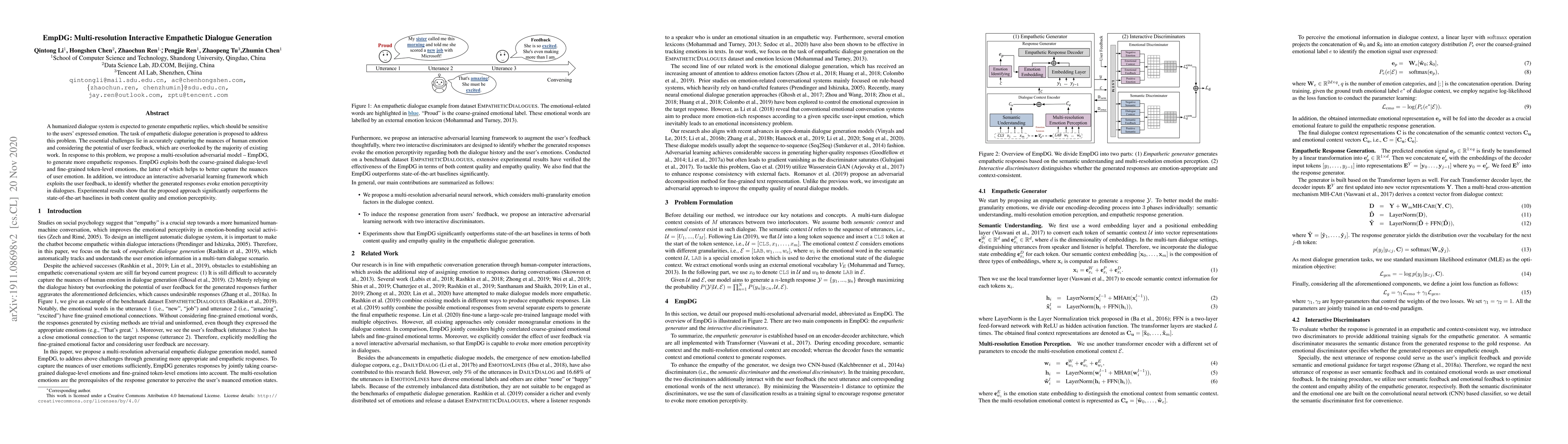 The paper proposes EmpDG, a multi-resolution adversarial model for empathetic dialogue generation that captures both coarse-grained and fine-grained emotional nuances. It employs an interactive adversarial learning framework to utilize user feedback, significantly improving response quality and emotion perceptivity over existing methods.