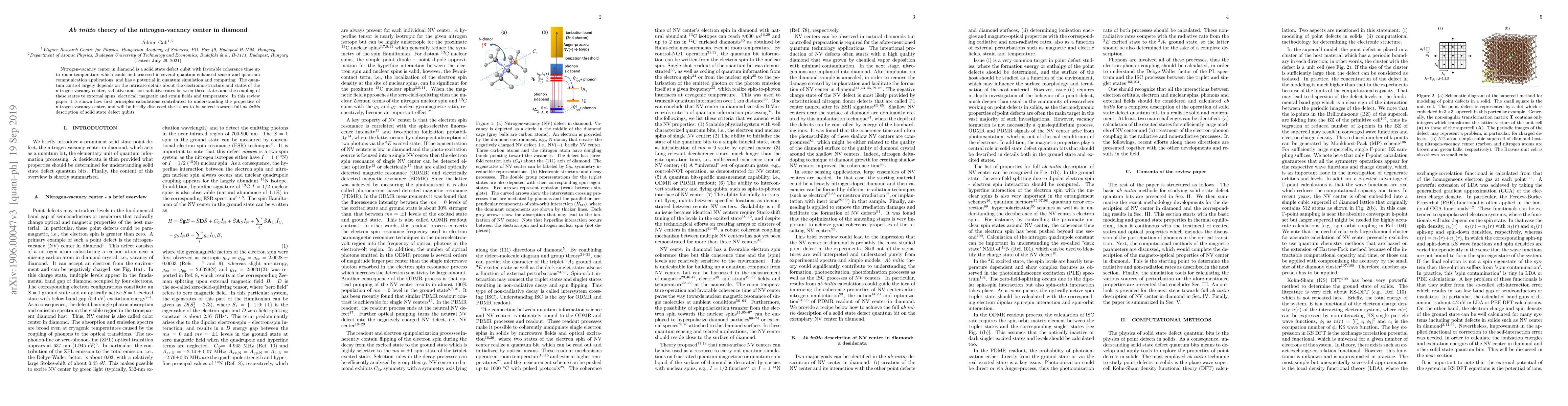 Nitrogen-vacancy center in diamond is a solid state defect qubit with favorable coherence time up to room temperature which could be harnessed in several quantum enhanced sensor and quantum communication applications, and has a potential in quantum simulation and computing. The quantum control largely depends on the intricate details about the electronic structure and states of the nitrogen-vacancy center, radiative and non-radiative rates between these states and the coupling of these states to external spins, electrical, magnetic and strain fields and temperature. In this review paper it is shown how first principles calculations contributed to understanding the properties of nitrogen-vacancy center, and will be briefly discussed the issues to be solved towards full \emph{ab initio} description of solid state defect qubits.