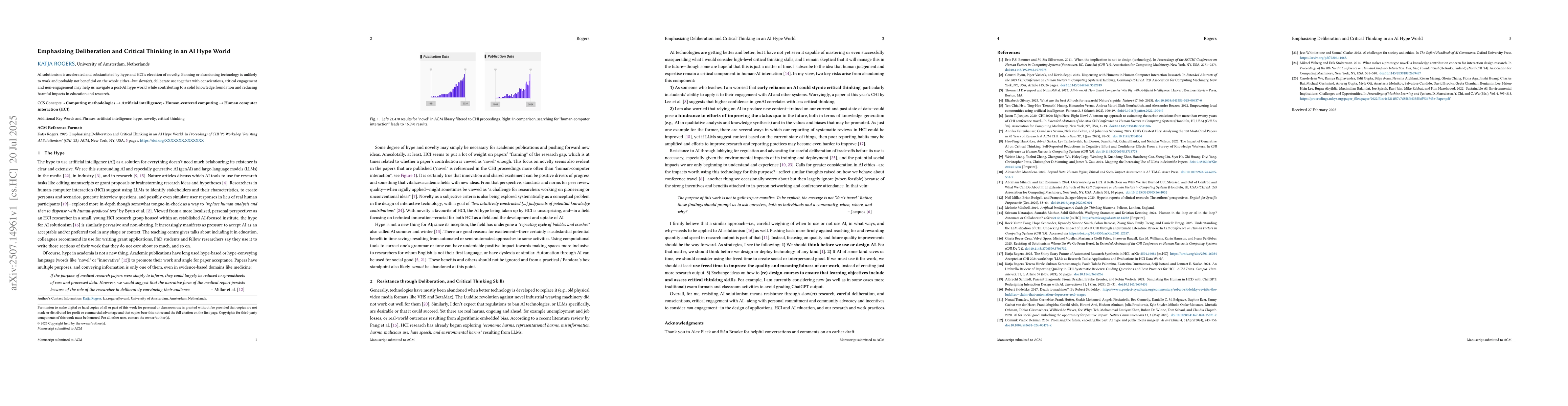 AI solutionism is accelerated and substantiated by hype and HCI's elevation of novelty. Banning or abandoning technology is unlikely to work and probably not beneficial on the whole either -- but slow(er), deliberate use together with conscientious, critical engagement and non-engagement may help us navigate a post-AI hype world while contributing to a solid knowledge foundation and reducing harmful impacts in education and research.