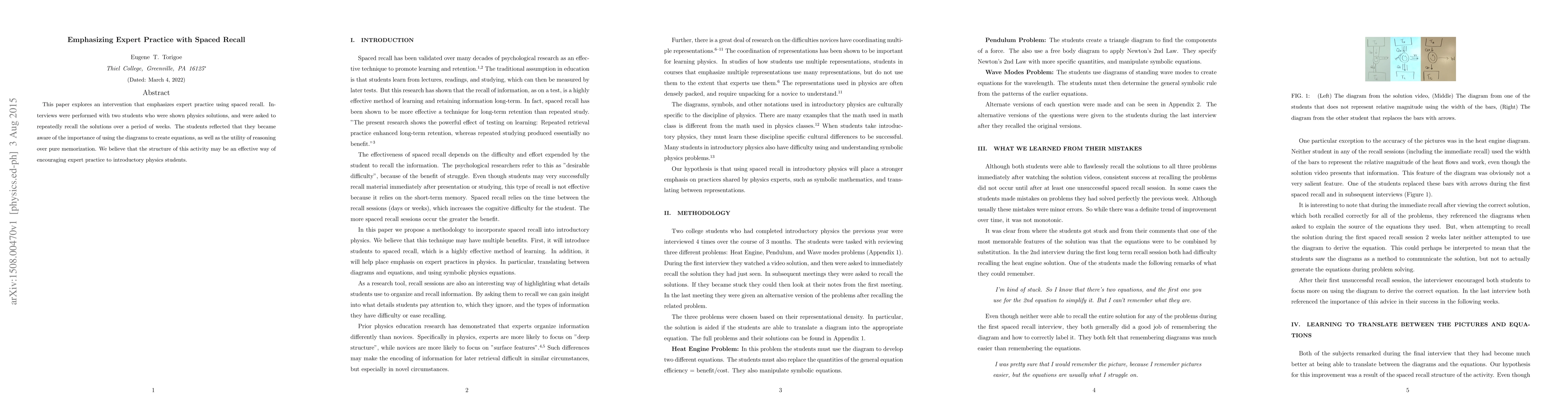 This study investigates an intervention using spaced recall to promote expert practice among introductory physics students, finding that repeated recall of solutions enhances diagram-equation connections and reasoning over memorization. The structured activity appears effective in fostering expert-like thinking.