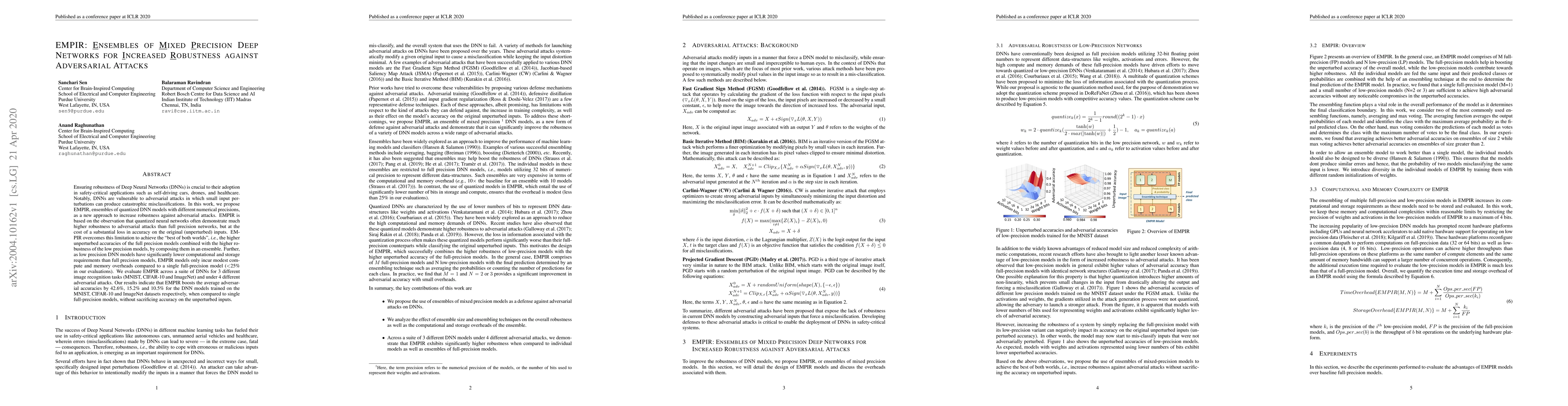 Ensuring robustness of Deep Neural Networks (DNNs) is crucial to their adoption in safety-critical applications such as self-driving cars, drones, and healthcare. Notably, DNNs are vulnerable to adversarial attacks in which small input perturbations can produce catastrophic misclassifications. In this work, we propose EMPIR, ensembles of quantized DNN models with different numerical precisions, as a new approach to increase robustness against adversarial attacks. EMPIR is based on the observation that quantized neural networks often demonstrate much higher robustness to adversarial attacks than full precision networks, but at the cost of a substantial loss in accuracy on the original (unperturbed) inputs. EMPIR overcomes this limitation to achieve the 'best of both worlds', i.e., the higher unperturbed accuracies of the full precision models combined with the higher robustness of the low precision models, by composing them in an ensemble. Further, as low precision DNN models have significantly lower computational and storage requirements than full precision models, EMPIR models only incur modest compute and memory overheads compared to a single full-precision model (<25% in our evaluations). We evaluate EMPIR across a suite of DNNs for 3 different image recognition tasks (MNIST, CIFAR-10 and ImageNet) and under 4 different adversarial attacks. Our results indicate that EMPIR boosts the average adversarial accuracies by 42.6%, 15.2% and 10.5% for the DNN models trained on the MNIST, CIFAR-10 and ImageNet datasets respectively, when compared to single full-precision models, without sacrificing accuracy on the unperturbed inputs.