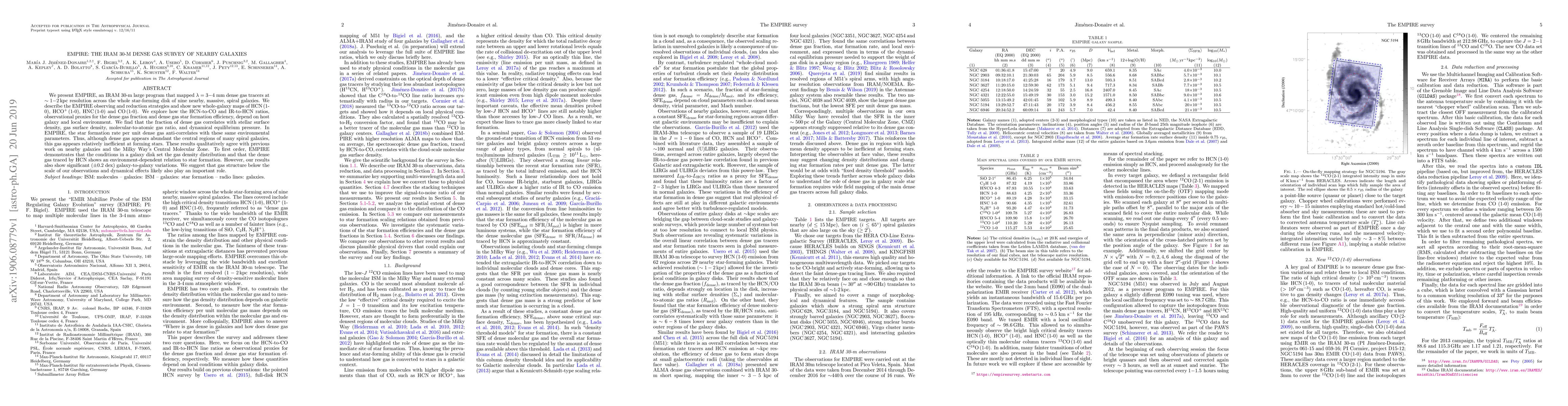 EMPIRE is a large survey using the IRAM 30-m telescope to map dense gas tracers in nine nearby spiral galaxies, revealing that dense gas correlates with stellar and gas surface densities but is relatively inefficient at star formation in central regions. Significant galaxy-to-galaxy variations suggest additional factors like gas structure and dynamical effects influence these relationships.