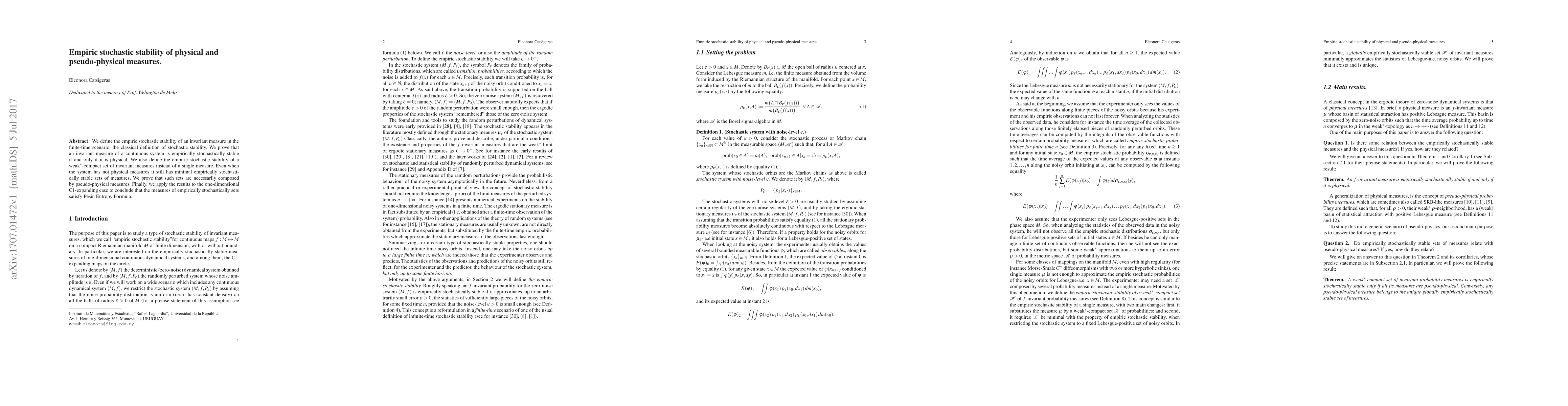 We define the empiric stochastic stability of an invariant measure in the finite-time scenario, the classical definition of stochastic stability. We prove that an invariant measure of a continuous system is empirically stochastically stable if and only if it is physical. We also define the empiric stochastic stability of a weak*-compact set of invariant measures instead of a single measure. Even when the system has not physical measures it still has minimal empirically stochastically stable sets of measures. We prove that such sets are necessarily composed by pseudo-physical measures. Finally, we apply the results to the one-dimensional C1-expanding case to conclude that the measures of empirically stochastically sets satisfy Pesin Entropy Formula.