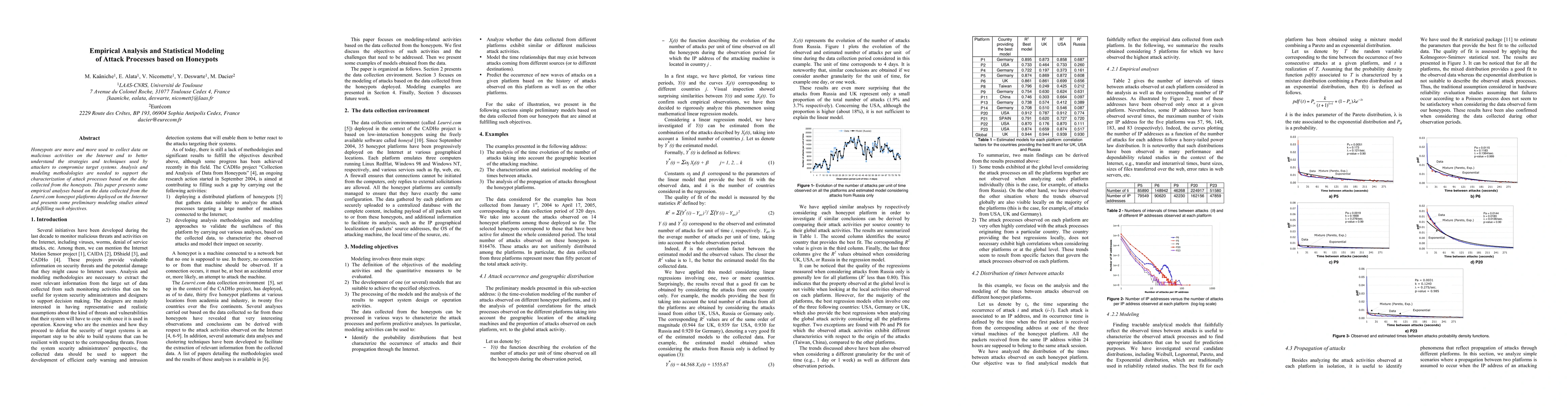 Honeypots are more and more used to collect data on malicious activities on the Internet and to better understand the strategies and techniques used by attackers to compromise target systems. Analysis and modeling methodologies are needed to support the characterization of attack processes based on the data collected from the honeypots. This paper presents some empirical analyses based on the data collected from the Leurr{\'e}.com honeypot platforms deployed on the Internet and presents some preliminary modeling studies aimed at fulfilling such objectives.