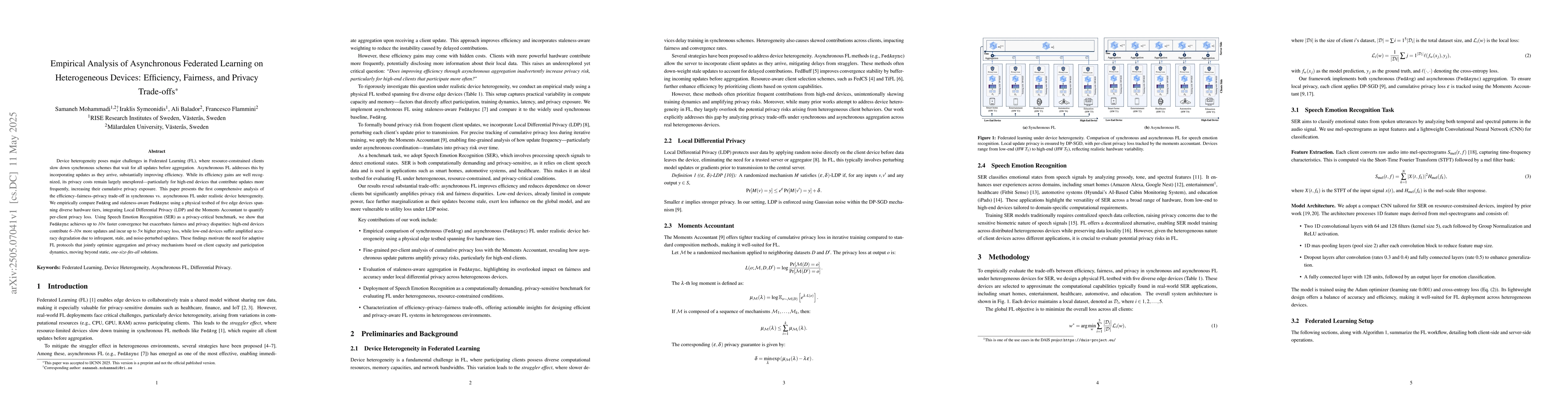 A study analyzes asynchronous Federated Learning on heterogeneous devices, showing that it improves efficiency but exacerbates fairness and privacy disparities.