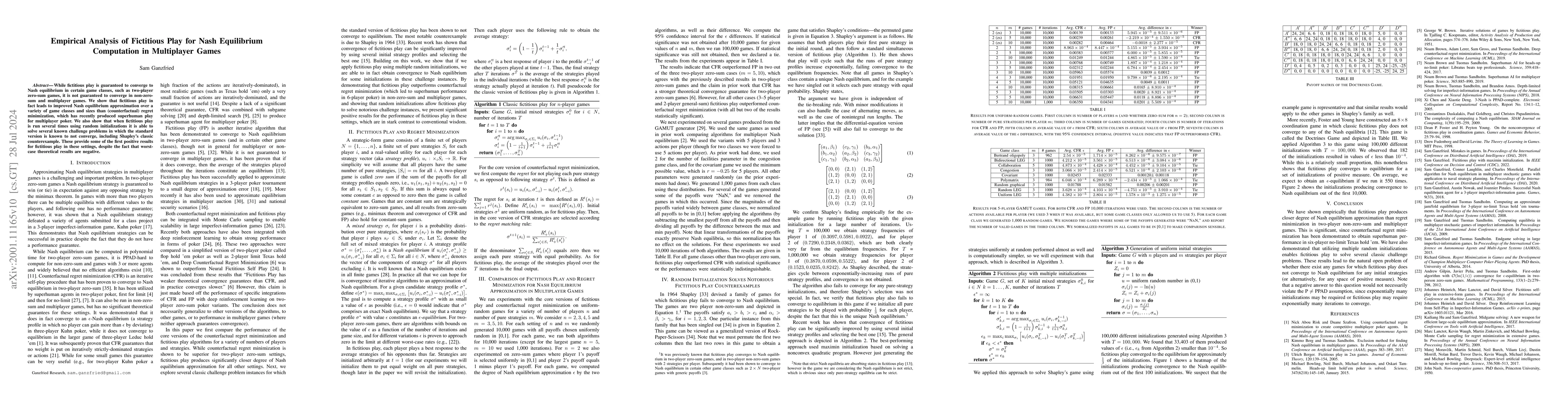 Fictitious play converges better to Nash equilibrium in various multiplayer games than regret minimization, and multiple runs with random initializations solve problems where standard fictitious play fails, offering new hope for its effectiveness in complex scenarios.